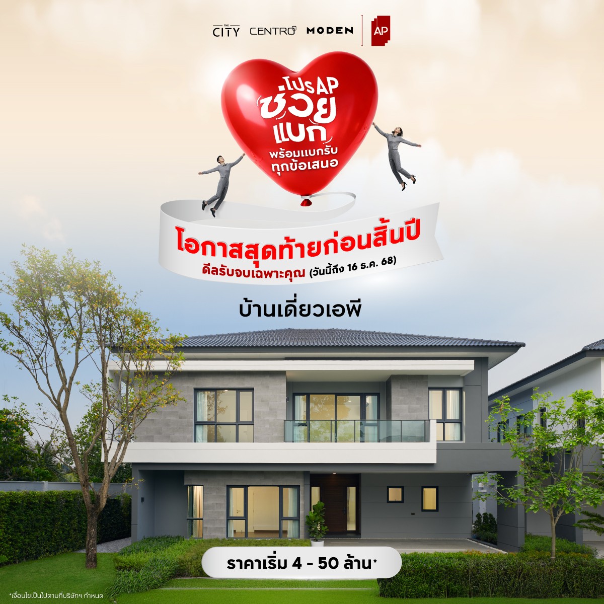 บ้านเดี่ยวเอพี โครงการคุณภาพจากแบรนด์ THE CITY – CENTRO – MODEN ราคาเริ่ม 4 – 50 ล้านบาท กับสิทธิประโยชน์พิเศษแบบกระหน่ำมีให้เลือกรับตามความต้องการ ไม่ว่าจะเป็น “โปรเพิ่มเพิ่มเพิ่ม ‘รับเพิ่ม 3 ต่อ’” ต่อที่ 1 บ้านเดี่ยว THE CITY รับส่วนลดสูงสุด 10 ล้านบาท*, โครงการ CENTRO ฟรีส่วนกลางสูงสุด 10 ปี* โครงการ MODEN รับฟรีเฟอร์นิเจอร์มูลค่าสูงสุด 100,000 บาท* ต่อที่ 2 รับเพิ่ม ทองคำมูลค่าสูงสุด 500,000 บาท* ต่อที่ 3 ทุกหลัง ลุ้นรับทองคำรวมมูลค่ากว่า 3 ล้านบาท* (สิทธิ์ลุ้นทองคำจะแตกต่างตามเดือนที่จองและโอน สิ้นสุดธันวาคม 2568) หรือ “โปรอยู่ฟรีสูงสุด 3 ปี ที่จะตอบโจทย์ลูกค้าที่ต้องการสิทธิประโยชน์ทางการเงิน เพราะให้อยู่ฟรี และได้ดอกเบี้ยพิเศษ 0% นาน 1 ปี ผ่อนต่ำล้านละ 900 บาทต่อเดือน* สิทธิประโยชน์นี้มีให้ถึง 16 ธันวาคม 2568 เท่านั้น