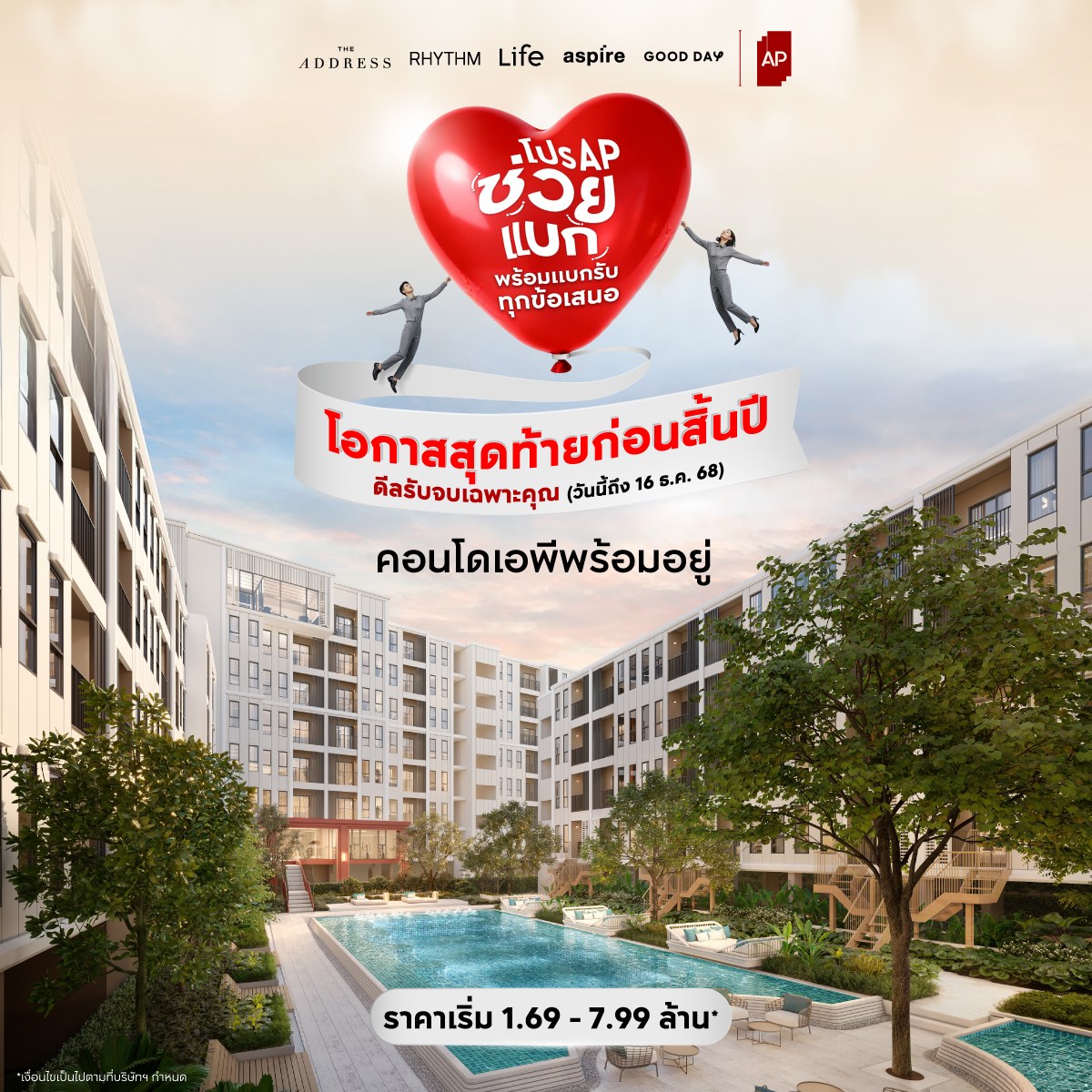 คอนโดพร้อมอยู่ของเอพี ราคาตั้งแต่ 1.69 – 7.99 ล้านบาท กับข้อเสนอสุดพิเศษ อยู่ฟรีสูงสุด 2 ปี* และฟรีค่าส่วนกลางสูงสุด 5 ปี พร้อมจัดเต็มของแถมรวมมูลค่าสูงสุด 500,000 บาท* ช่วยแบกภาระอันหนักอึ้ง ให้ลูกค้าสามารถเข้าอยู่ได้ทันทีแบบไร้กังวล ครอบคลุมค่าใช้จ่ายวันโอน ค่าส่วนกลาง แพ็กเกจเฟอร์นิเจอร์ และเครื่องใช้ไฟฟ้าครบชุด ให้ได้เลือกเริ่มชีวิตดีๆ ที่หลากหลายโครงการคุณภาพของเอพีในแบบของตน อาทิ GOOD DAY สุขุมวิท 93 (พร้อมอยู่ต้นปี 2569), ASPIRE สุขุมวิท-พระราม 4, LIFE พหลฯ-ลาดพร้าว, RHYTHM เอกมัย เอสเตท และ THE ADDRESS สยาม-ราชเทวี รับข้อเสนอพิเศษนี้ได้ ถึง 16 ธันวาคม 2568 เท่านั้น