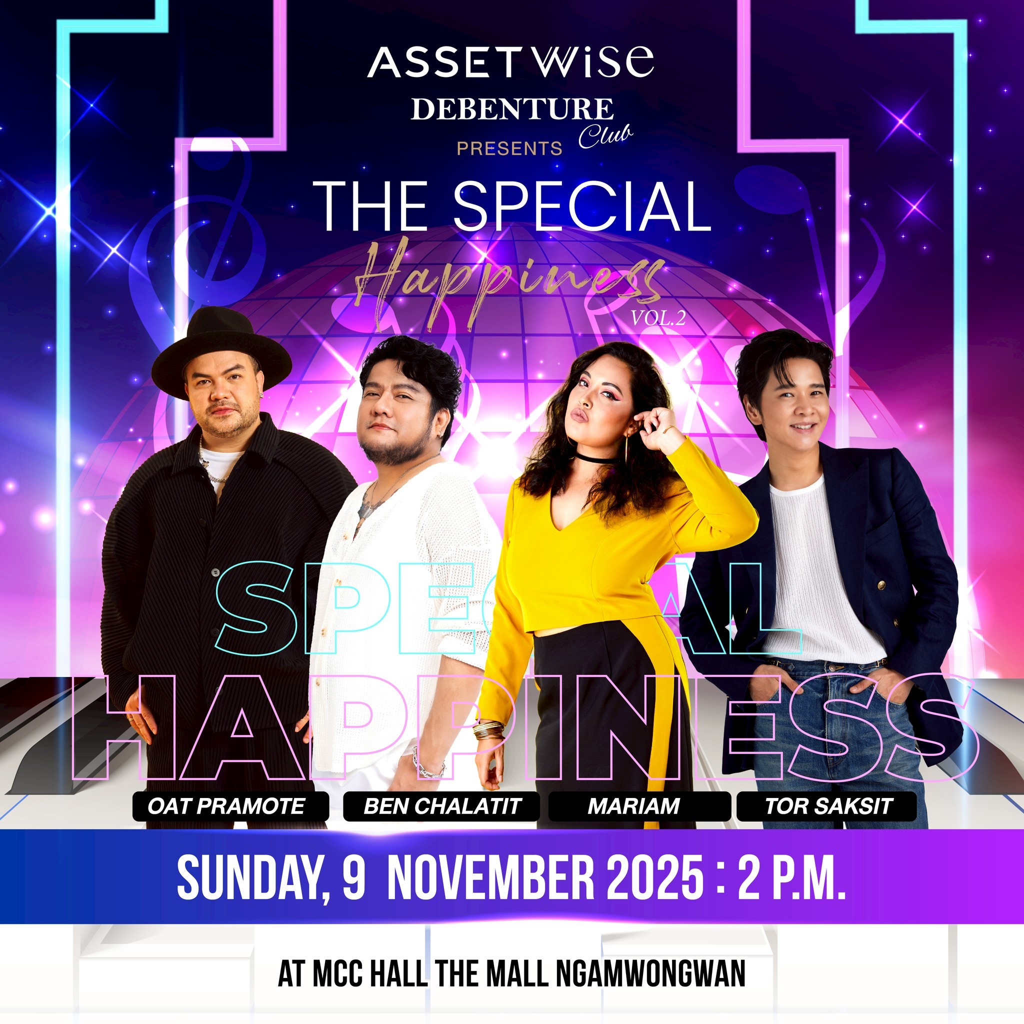 บริษัท แอสเซทไวส์ จำกัด (มหาชน) หรือ ASW ชวนผู้ถือหุ้นกู้ของบริษัท สัมผัสความสุขสุดพิเศษกับคอนเสิร์ต AssetWise Debenture Club Present “The Special Happiness Concert Vol.2” คอนเสิร์ตสุดพิเศษแห่งปีแทนคำขอบคุณให้กับผู้ถือหุ้นกู้ พบกับการรวมตัวของ 4 พลังเสียงคุณภาพ นำโดยโต๋-ศักดิ์สิทธิ์ เวชสุภาพร มือเปียโนยืนหนึ่ง เสริมทัพด้วยศิลปินสายดีโว่ระดับตัวท็อป โอ๊ต-ปราโมทย์ ปาทาน, เบน-ชลาทิศ ตันติวุฒิ และดีว่าตัวแม่ มาเรียม เกรย์ อัคคาลาลี ที่จะมาสร้างบรรยากาศแห่งรอยยิ้ม เสียงหัวเราะ ความสุข และบทเพลงที่จะตราตรึงใจผู้ถือหุ้นกู้ทุกท่าน มาร่วมสัมผัสความสุขจัดเต็มแบบไม่มีกั๊ก
