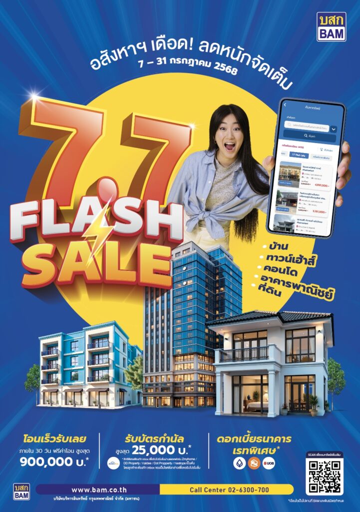 บริษัทบริหารสินทรัพย์ กรุงเทพพาณิชย์ จำกัด (มหาชน) หรือ BAM เดินหน้ากระตุ้นตลาดอสังหาริมทรัพย์ จัดแคมเปญใหญ่ “BAM FLASH SALE 7.7” ระหว่างวันที่ 7 – 31 กรกฎาคม 2568 ขนทรัพย์สินรอการขาย ทั้งบ้านเดี่ยว ทาวน์เฮ้าส์ คอนโดมิเนียม อาคารพาณิชย์ ที่ดิน กว่า 170 รายการ มูลค่ารวมกว่า 550 ล้านบาท มาลดราคาพิเศษ สูงสุดกว่า 30 % ลูกค้าที่ซื้อทรัพย์ภายใต้แคมเปญและโอนกรรมสิทธิ์ภายใน 30 วัน นับจากวันอนุมัติจะได้รับสิทธิพิเศษทันที ได้แก่ ฟรีค่าโอนสูงสุด 900,000 บาท บัตรกำนัลมูลค่าสูงสุด 25,000 บาท พร้อมสินเชื่ออัตราดอกเบี้ยพิเศษจากธนาคารพันธมิตรที่เข้าร่วม นอกจากนี้ ใครที่กำลังมองหาอสังหาฯ ทั้งเพื่ออยู่อาศัยหรือลงทุน ห้ามพลาดกิจกรรม “BAM TROOP” ลงพื้นที่วันที่ 7 เดือน 7 พบกันได้ที่ ตลาดละลายทรัพย์ สีลม BTS ช่องนนทรี และ ตลาดรวมทรัพย์ อโศก