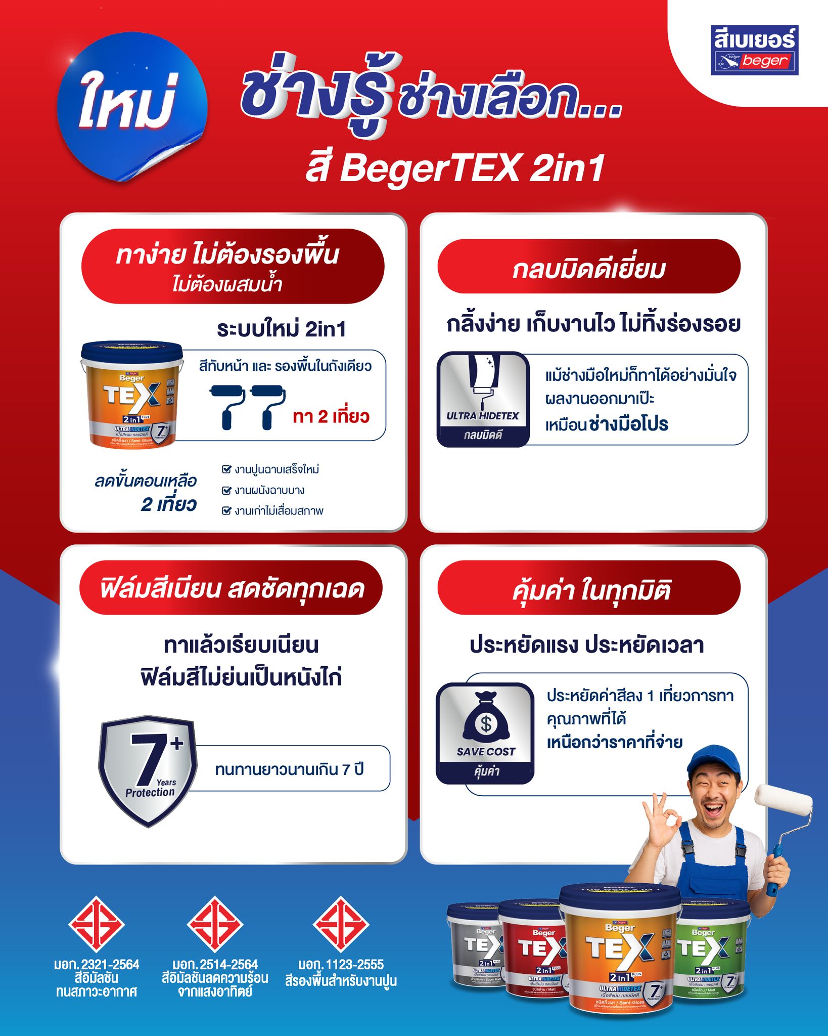 BegerTEX — Standard ที่ไม่ธรรมดา BegerTEX เป็น สินค้าน้องใหม่ในกลุ่มสีเกรดมาตรฐาน (Standard Segment) แต่ให้คุณภาพระดับ High Quality ที่ออกแบบมาเพื่อตอบโจทย์ “ตลาดจริง” โดยเฉพาะ ภายใต้แนวคิด “Standard ที่ไม่ธรรมดา” มอบคุณภาพสูงกว่าในระดับราคาเดียวกัน โดดเด่นด้วยคุณสมบัติ เนียน แน่น เนียบ ทาง่าย ปกปิดดี งานจบไว ประหยัดสีและเวลา จนได้รับเสียงยืนยันจากช่างทั่วประเทศว่า “ของดี ใช้งานง่าย ซื้อซ้ำแน่นอน”