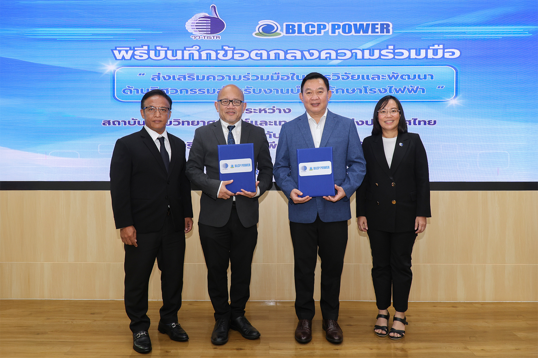 นายยุทธนา เจิรญวงศ์ (ที่สองจากซ้าย) กรรมการผู้จัดการใหญ่ บริษัท บีแอลซีพี เพาเวอร์ จำกัด (BLCP Power Limited) หรือ โรงไฟฟ้าบีแอลซีพี และ ผู้ช่วยศาสตราจารย์ ดร.วีรชัย อาจหาญ (ที่สองจากขวา) ผู้ว่าการสถาบันวิจัยวิทยาศาสตร์และเทคโนโลยีแห่งประเทศไทย (วว.) ร่วมลงนามความร่วมมือในการวิจัยและพัฒนาด้านวิศวกรรมสำหรับงานบำรุงรักษาโรงไฟฟ้า เพื่อพัฒนาเทคโนโลยีและปรับปรุงกิจกรรมการดำเนินงานของโรงไฟฟ้า โดยมีเป้าหมายในการยกระดับความพร้อมการใช้งานและความน่าเชื่อถือของโรงไฟฟ้าในระยะยาว สำหรับการลงนามครั้งนี้มี นายอดุลย์ อุดมวรวุฒิ (คนแรกซ้าย) รองผู้จัดการใหญ่ บริษัท บีแอลซีพี เพาเวอร์ จำกัด (BLCP Power Limited) และ ดร.โศรดา วัลภา (คนแรกขวา) รองผู้ว่าการบริการอุตสาหกรรม ร่วมเป็นสักขีพยาน เมื่อเร็วๆ นี้
