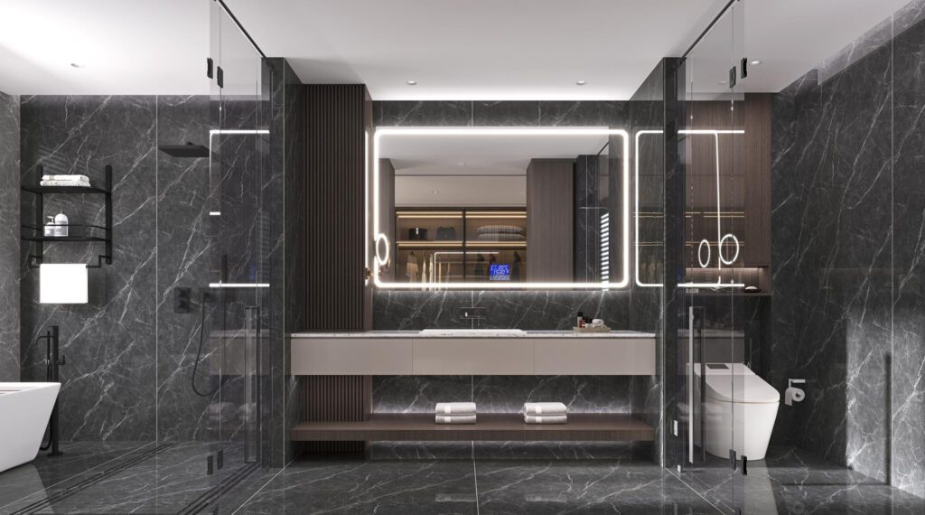 แสงสว่างเป็นองค์ประกอบสำคัญที่มักถูกมองข้ามในการออกแบบห้องน้ำ ควรออกแบบแสงให้ครอบคลุมทั่วพื้นที่ โดยเฉพาะบริเวณกระจกและพื้นที่ใช้งานหลัก แนะนำให้ใช้แสงธรรมชาติควบคู่กับแสงประดิษฐ์ เพื่อสร้างบรรยากาศที่สดใสและสว่างสะอาด