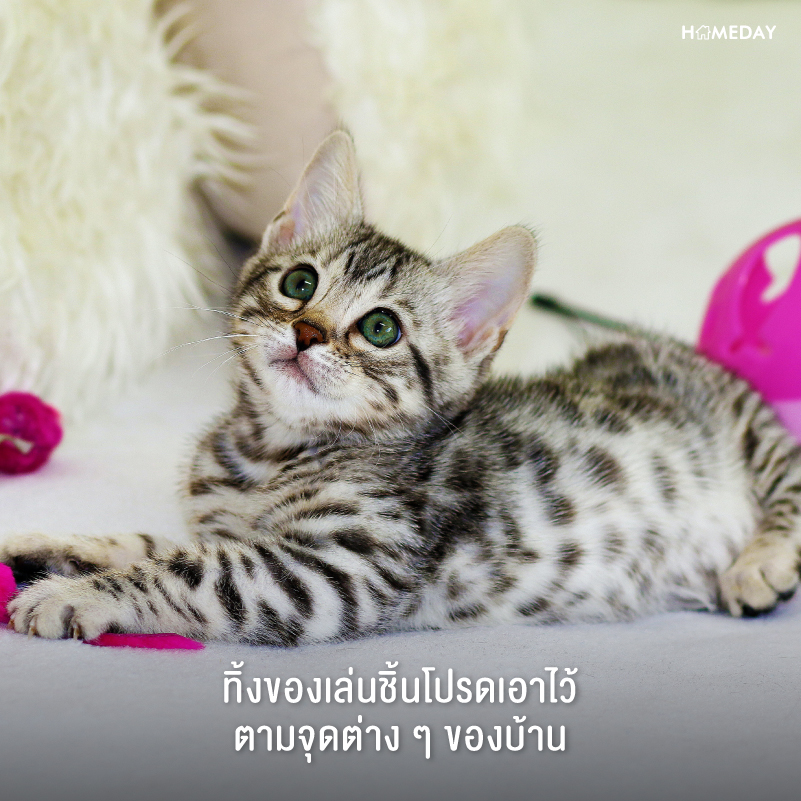สิ่งสำคัญลำดับแรก คือการเก็บซ่อนหรือทิ้ง สิ่งของใด ๆ ก็ตาม ที่อาจเป็นอันตรายกับน้องแมวได้เมื่อเราไม่อยู่ เช่น