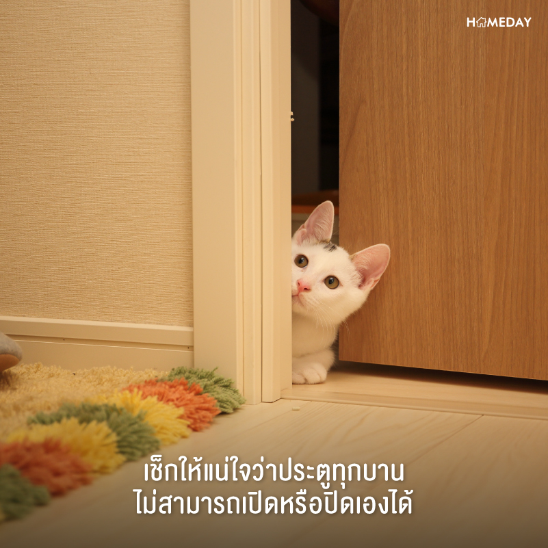หากประตูทุกหลังในบ้านของเราไม่ได้เจาะประตูสำหรับแมว ต้องแน่ใจว่าประตูเหล่านั้น จะไม่สามารถเปิดหรือปิดขึ้นมาได้เอง จากแรงลม หรืออะไรก็ตาม เพราะบางครั้งน้องแมวนั้นสามารถเปิดและปิดประตูเองได้ ทั้งจากที่ตั้งใจและไม่ตั้งใจ ดังนั้นห้องไหนที่คิดว่าน้องแมวไม่น่าได้ใช้งาน และมีความเสี่ยงที่จะขังตัวเองเอาไว้ด้านใน ก็ให้เราปิดห้องนั้นให้สนิทก่อนออกจากบ้านได้เลย ส่วนห้องไหนที่จำเป็นต้องเปิดเอาไว้ ก็อย่าลืมหาของหนักมากั้นเอาไว้ด้วยครับ ส่วนบ้านไหนที่น้องแมวมีความสามารถมากหน่อย ก็แนะนำให้ล็อกประตูให้สนิทด้วยครับ
