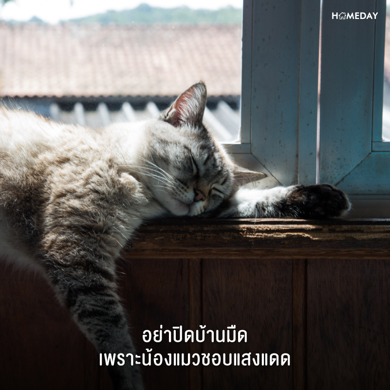 แม้ว่าแดดบ้านเราจะร้อนแรงเพียงไหน แต่น้องแมวก็ยังชอบแสงแดดอยู่ดี ดังนั้นอย่าลืมหาที่ที่เหมาะ เปิดรับแสงเอาไว้สัก 1-2 จุดในบ้านด้วยนะครับ แต่ไม่แนะนำให้เปิดจนหมดนะครับ ใครผ่านไปมา รู้ว่าเจ้าของไม่อยู่บ้านนาน ๆ มองเห็นของในบ้านหมดแบบนี้ อาจจะเป็นอัตรายได้ครับ