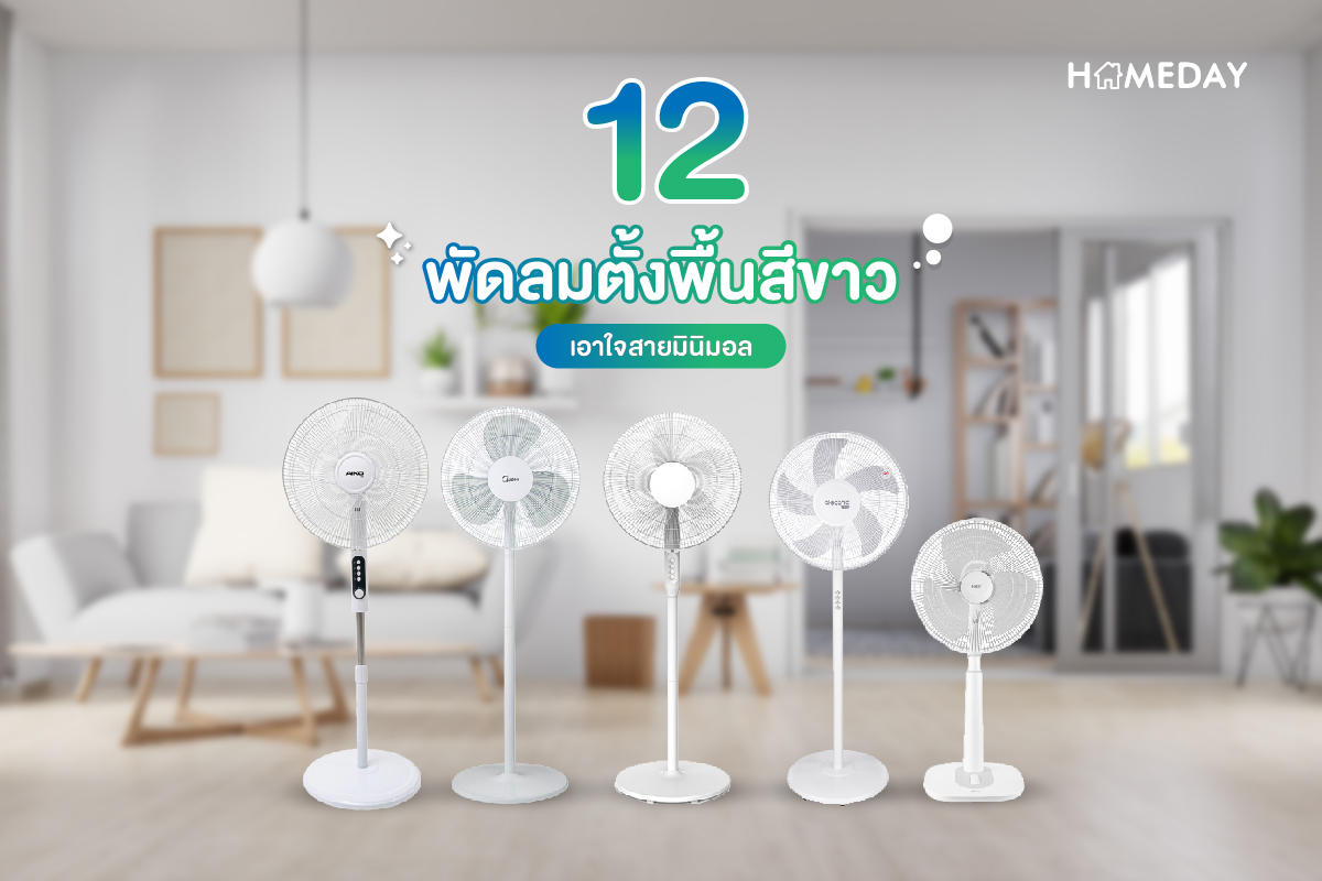 พัดลม เป็นหนึ่งในเครื่องใช้ไฟฟ้าคู่ครัวเรือนไทยที่ต้องมีติดประจำห้องละ 1 ตัวกันเลยใช่มั้ยล่ะคะ ตัวเลือกก็มีมากมาย ทั้งแบบวางตั้งพื้น แขวนผนัง และแขวนเพดาน รวมไปถึงมีจำนวนใบพัด ขนาด ความสูง ฟังก์ชันต่าง ๆ ให้เลือกมากมาย แต่สิ่งหนึ่งที่หลาย ๆ แบรนด์มีเหมือน ๆ กัน คือในเรื่องของ ‘สีสัน’ ค่ะ พัดลมส่วนใหญ่จะมีสีสดใสหลากหลายสีให้เลือกใช่มั้ยล่ะคะ อย่างเรียบง่ายที่สุดเท่าที่จะหาได้ก็มักจะเป็นสีดำ หรือสีเทา การจะหาพัดลมมินิมอล สีขาว เรียบง่ายนั้น ถือว่ายากพอสมควรเลยค่ะ แต่ในตอนนี้ ก็เริ่มมีหลายแบรนด์ที่ผลิตพัดลมสีขาวสไตล์มินิมอลกันออกมาตามท้องตลาดค่อนข้างเยอะพอสมควรเลยค่ะ วันนี้ Homeday ก็เลยหยิบพัดลมสีขาว 12 รุ่นจาก 12 แบรนด์มาฝากทุกคนกัน แต่ละรุ่นจะมีดีไซน์และฟังก์ชันการใช้งานอย่างไรบ้างนั้น ติดตามต่อในบทความนี้ได้เลยค่ะ