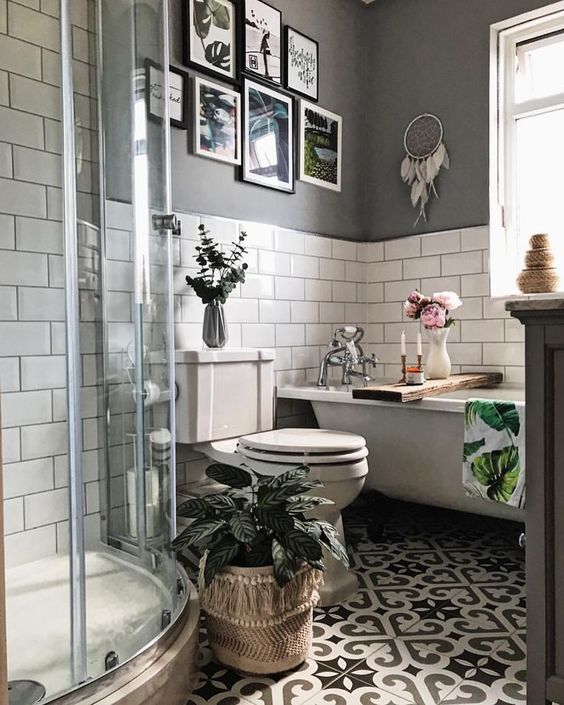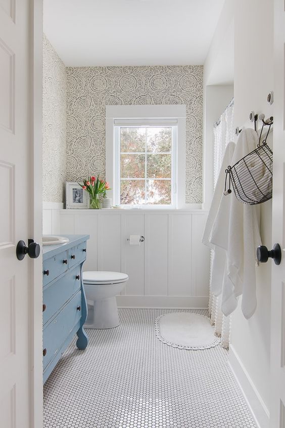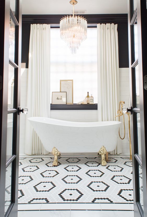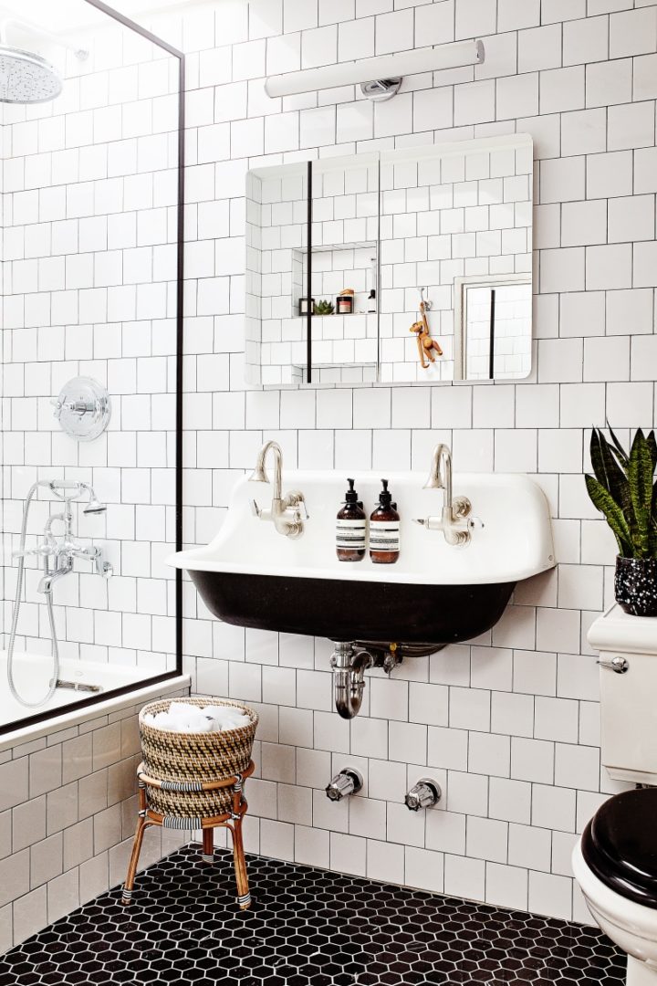 กระเบื้องห้องน้ำสีดำกับผนังสีขาว เป็นอะไรที่เข้ากันได้อย่างลงตัวเลยล่ะค่ะ อย่างในภาพนี้ก็เลือกใช้กระเบื้องปูพื้นหกเหลี่ยมขนาดเล็กสีดำเข้ากับผนังที่ปูด้วยกระเบื้องสีขาวสี่เหลี่ยมจัตุรัสขนาดเล็ก ดูมีลูกเล่นซับซ้อน เหมาะสำหรับบ้านสไตล์วินเทจ ที่ไม่อยากให้ดูฉูดฉาดเกินไปค่ะ