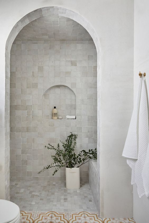 กระเบื้องปูพื้นห้องน้ำมาราเกช หรือถ้าให้อธิบายแบบเข้าใจง่าย ๆ ก็คือกระเบื้องที่มีลวดลายเชื่อมต่อกันนั่นเองค่ะ กระเบื้องสไตล์นี้เป็นที่นิยมในไทยเช่นกัน เพราะไม่ต้องคิดมาก ไม่ต้องออกแบบให้ยุ่งยาก เพียงแค่เลือกลวดลายและสีสันที่ชอบก็เป็นอันลงตัวแล้ว หลายคนมองว่ากระเบื้องรูปแบบนี้ ให้ความรู้สึกเชย ล้าสมัย แต่จริง ๆ แล้วถ้าเราแมชเข้ากับส่วนอื่น ๆ ภายในห้องน้ำให้ดี กระเบื้องมาราเกช จะช่วยขับความโดดเด่นสวยงามของห้องน้ำออกมาได้มากทีเดียวค่ะ หลักการก็ไม่ยากค่ะ เมื่อพื้นลายเยอะแล้ว ผนังและส่วนอื่น ๆ ภายในห้องน้ำต้องเรียบ ยิ่งเป็นสีขาวคลีน ๆ ได้ยิ่งดีเลยค่ะ