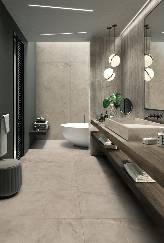 การปูพื้นห้องน้ำด้วยกระเบื้องหินธรรมชาติ อาจไม่ได้ให้ความรู้สึกแปลกใหม่เท่าไรนัก แต่ก็เป็นอีกหนึ่งสไตล์ที่มีความเรียบง่าย ไม่ตกยุค แถมยังแข็งแรง ทนทาน มีอายุการใช้งานที่ยืนยาว เนื่องจากเป็นวัสดุคุณภาพสูงที่มีราคาแพง ใครนึกอะไรไม่ออก หรืออยากได้ห้องน้ำที่ดูโมเดิร์น ๆ เรียบ ๆ สะอาดตา เลือกเป็นหินธรรมชาติแผ่นใหญ่ ๆ ได้เลยค่ะ