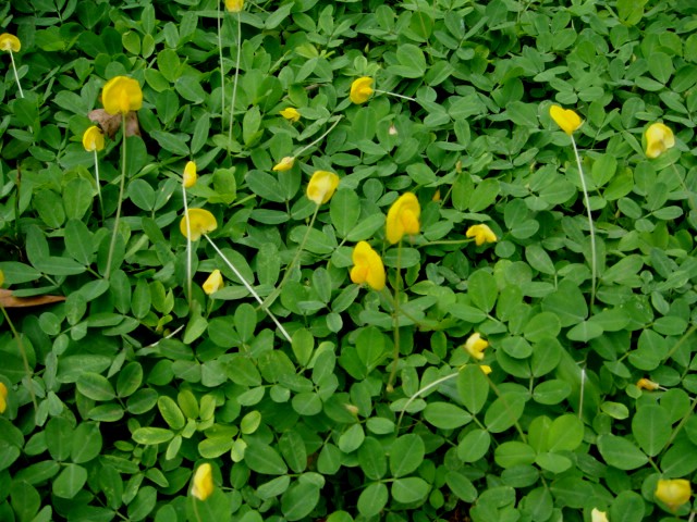 ต้นไม้คลุมดินทอดเลื้อยคลุมดินที่มีอายุหลายปี ใบเล็กน่ารัก มีดอกสีเหลืองสดใส “ต้นถั่วบราซิล”เป็นต้นไม้ทนแล้ง ทนลม และทนการเหยียบย่ำได้ดี นิยมปลูกคลุมหน้าดินแทนหญ้า สวยสดใสและช่วยให้ต้นไม้รอบ ๆ เจริญเติบโตได้ดี