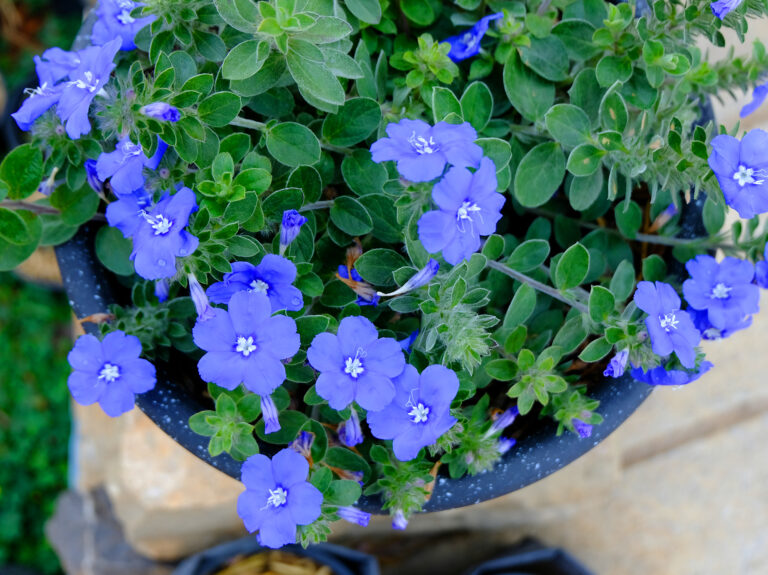 ต้นไม้คลุมดินทรงพุ่มขนาดเล็ก ลำต้นทอดเลื้อย ออกดอกสีม่วงสดใส “ต้นฟ้าประดิษฐ์” เป็นต้นที่ชอบแสงแดด นิยมปลูกใส่กระถางปล่อยลำต้นเลื้อย หรือนำมาปลูกคุลมหน้าดินก็ได้เช่นกัน