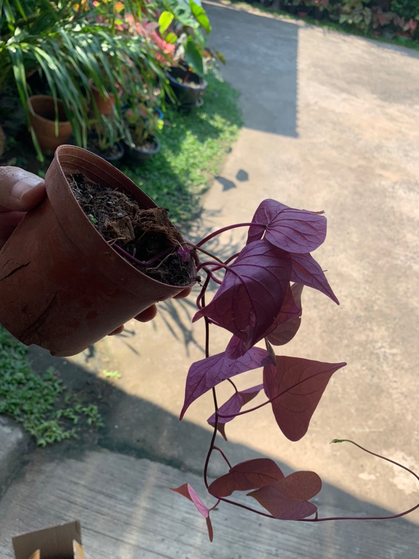 ต้นไม้เลื้อยคลุมดิน ลำต้นอวบน้ำ “ต้นมันเทศประดับ” มีหลายสายพันธุ์ ทั้งใบสีม่วง สีเหลือง และใบด่าง ทอดเลื้อยไปทั่วหน้าดิน ปลูกง่าย แต่อ่อนแอกับเพลี้ยที่คอยดูดกินน้ำเลี้ยงตามยอดใบ