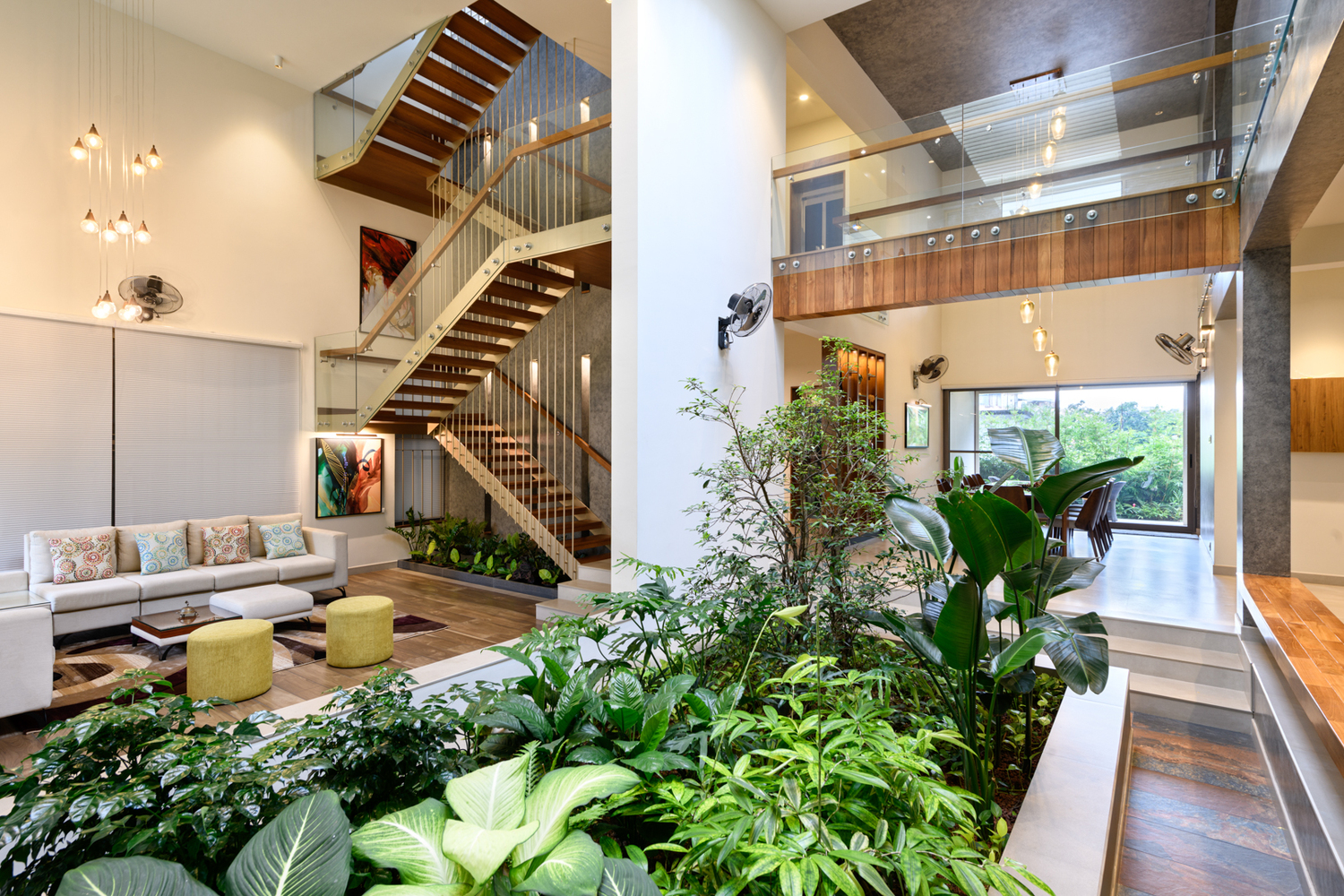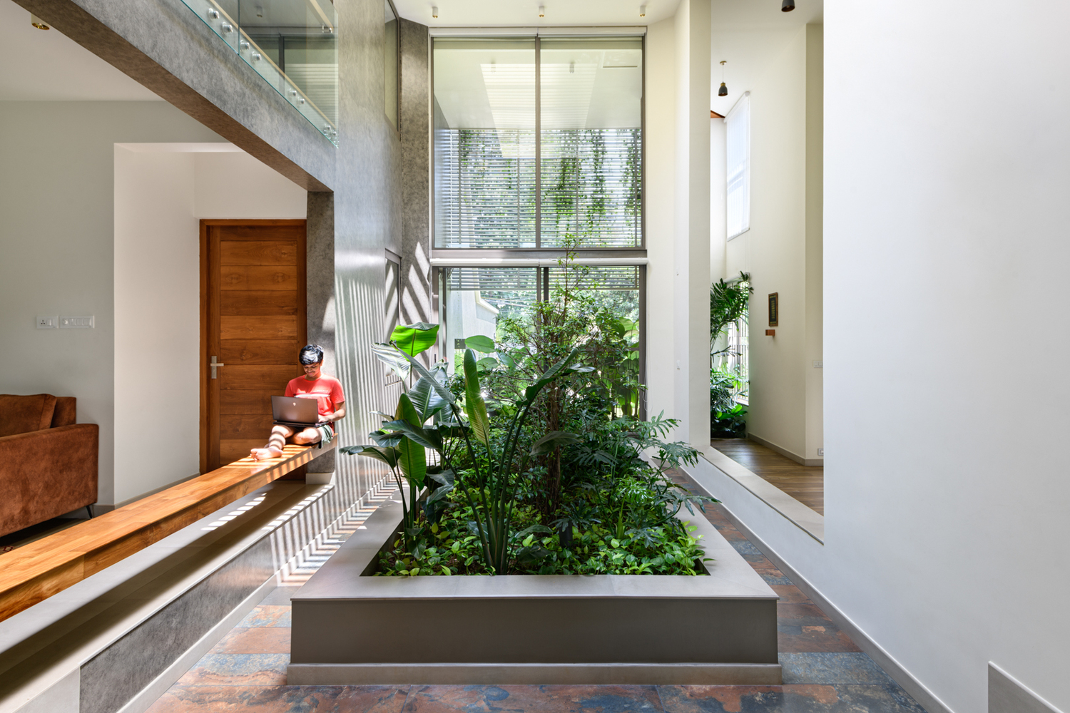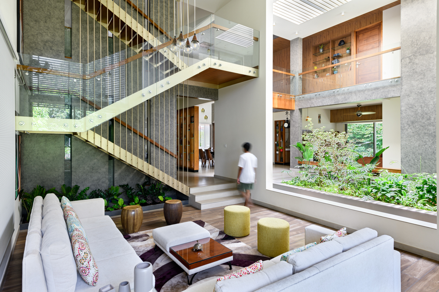 ไอเดียแต่งบ้านหลังนี้ออกแบบโดย Silpi Architects ตั้งอยู่ที่ประเทศอินเดียบนเนินเล็กๆ ทางทิศตะวันตก มีแนวคิดที่ต้องการดึงเอาภูมิทัศน์ของสวนสีเขียวที่อยู่ภายนอกมาเก็บไว้ภายในแบบ inside out- out side in ชวนให้แยกไม่ออกว่าตรงไหนเป็นบ้านตรงไหนคือสวน เพราะทั้งสองอย่างนั้นกลมกลืนกันเป็นหนึ่งเดียวได้อย่างสวยงาม