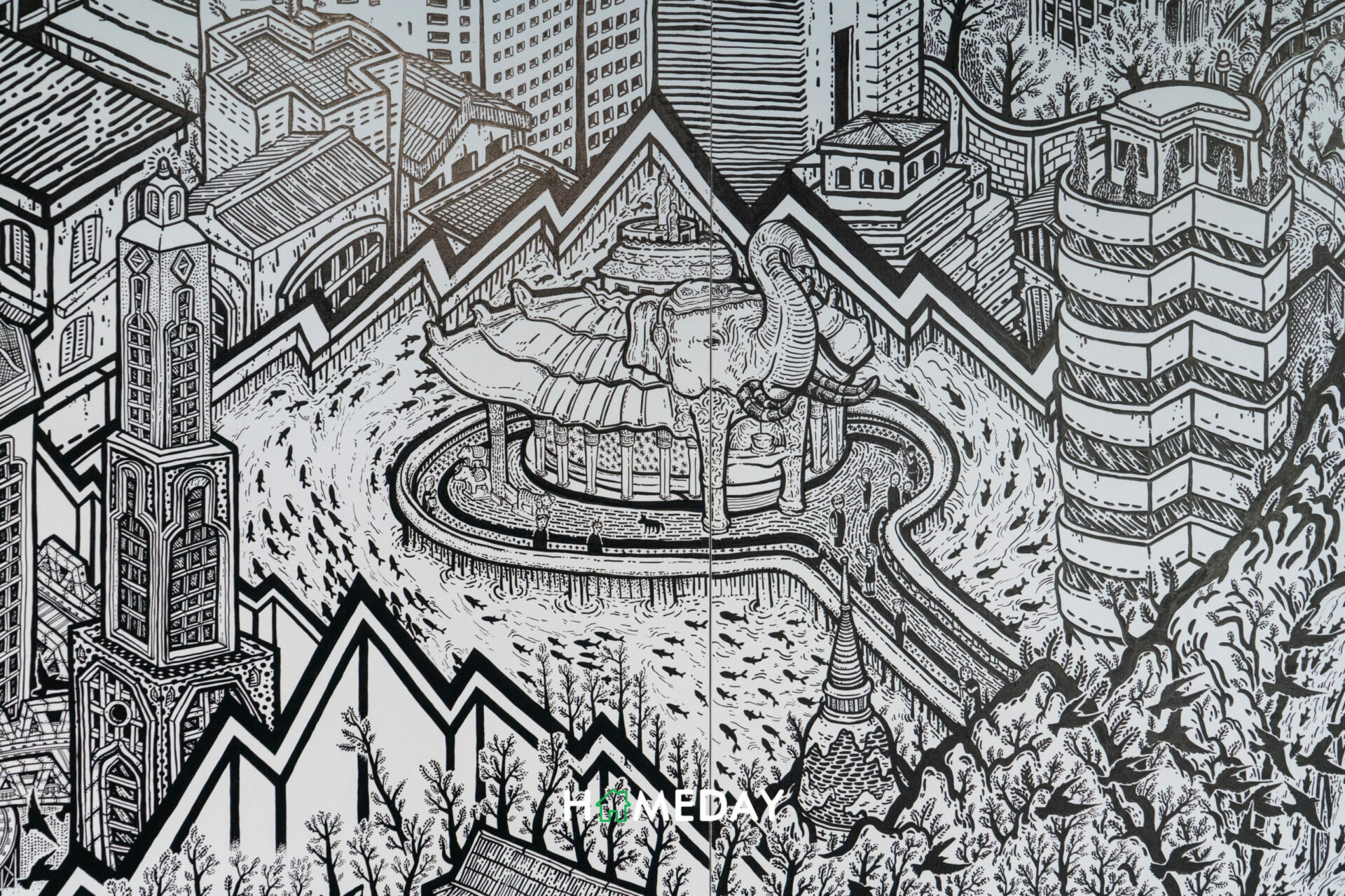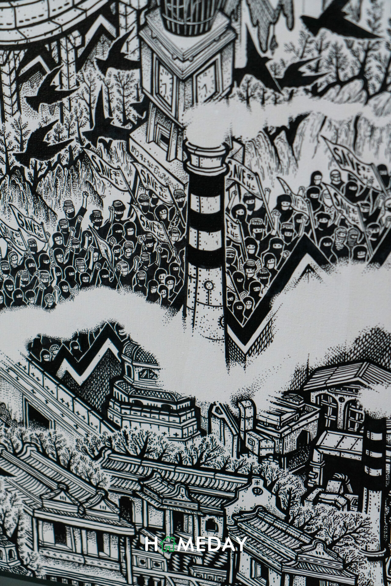 ซึ่งผลงานจะสะท้อนถึงความเป็นอยู่ของมนุษย์ผ่านเหตุการณ์ปัจจุบัน และที่เกิดขึ้นในประวัติศาสตร์ ภาพกิจกรรมของเมืองในมุมกว้างที่ให้ผู้ชมได้สำรวจเรื่องราวต่าง ๆ ทั้งประเด็นของสังคม และความเปลี่ยนแปลงของโลก นำเสนอด้วยความเรียบง่ายแต่เต็มไปด้วยรายละเอียดซับซ้อน เผยให้เห็นการจัดวางพื้นที่ทางสังคมในมุมกว้าง ไปจนถึงกิจกรรมของผู้คน ซึ่งแน่นอนว่า ตัวผู้ชมเอง จะเป็นตัวกลางที่เชื่อมต่อประสบการณ์ผ่านจิตรกรรมเหล่านี้ เพื่อเป็นส่วนหนึ่งของระบบนิเวศที่ประวัติศาสตร์และมนุษย์ในฐานะประชากรของโลกได้บรรจบกัน