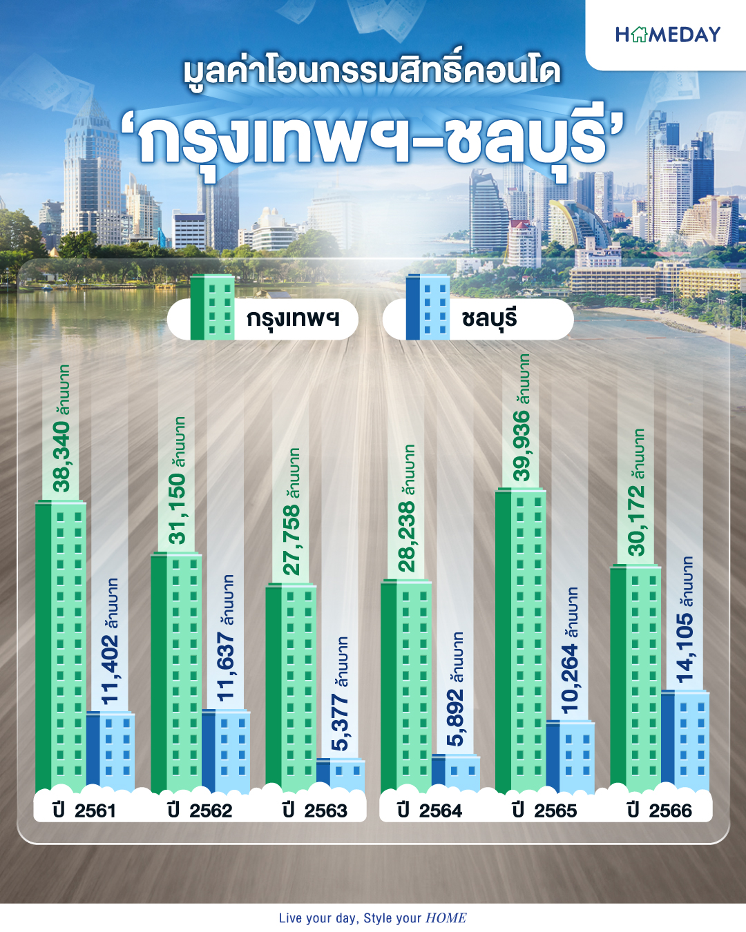 ปี 2561 กรุงเทพฯ 38,340 ล้านบาท ชลบุรี 11,402 ล้านบาทปี 2562 กรุงเทพฯ 31,150 ล้านบาท ชลบุรี 11,637 ล้านบาทปี 2563 กรุงเทพฯ 27,758 ล้านบาท ชลบุรี 5,377 ล้านบาทปี 2564 กรุงเทพฯ 28,238 ล้านบาท ชลบุรี 5,892 ล้านบาทปี 2565 กรุงเทพฯ 39,936 ล้านบาท ชลบุรี 10,264 ล้านบาทปี 2566 กรุงเทพฯ 30,172 ล้านบาท ชลบุรี 14,105 ล้านบาท