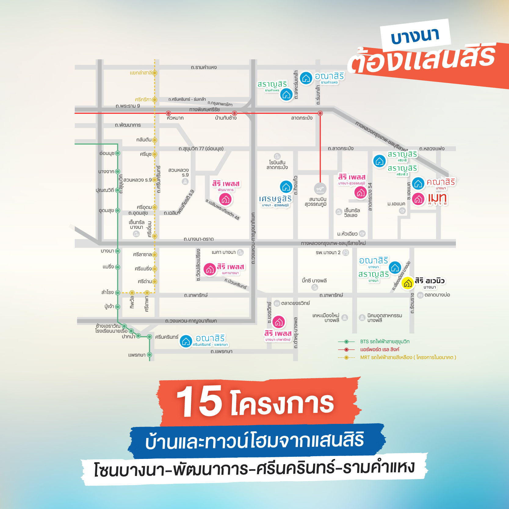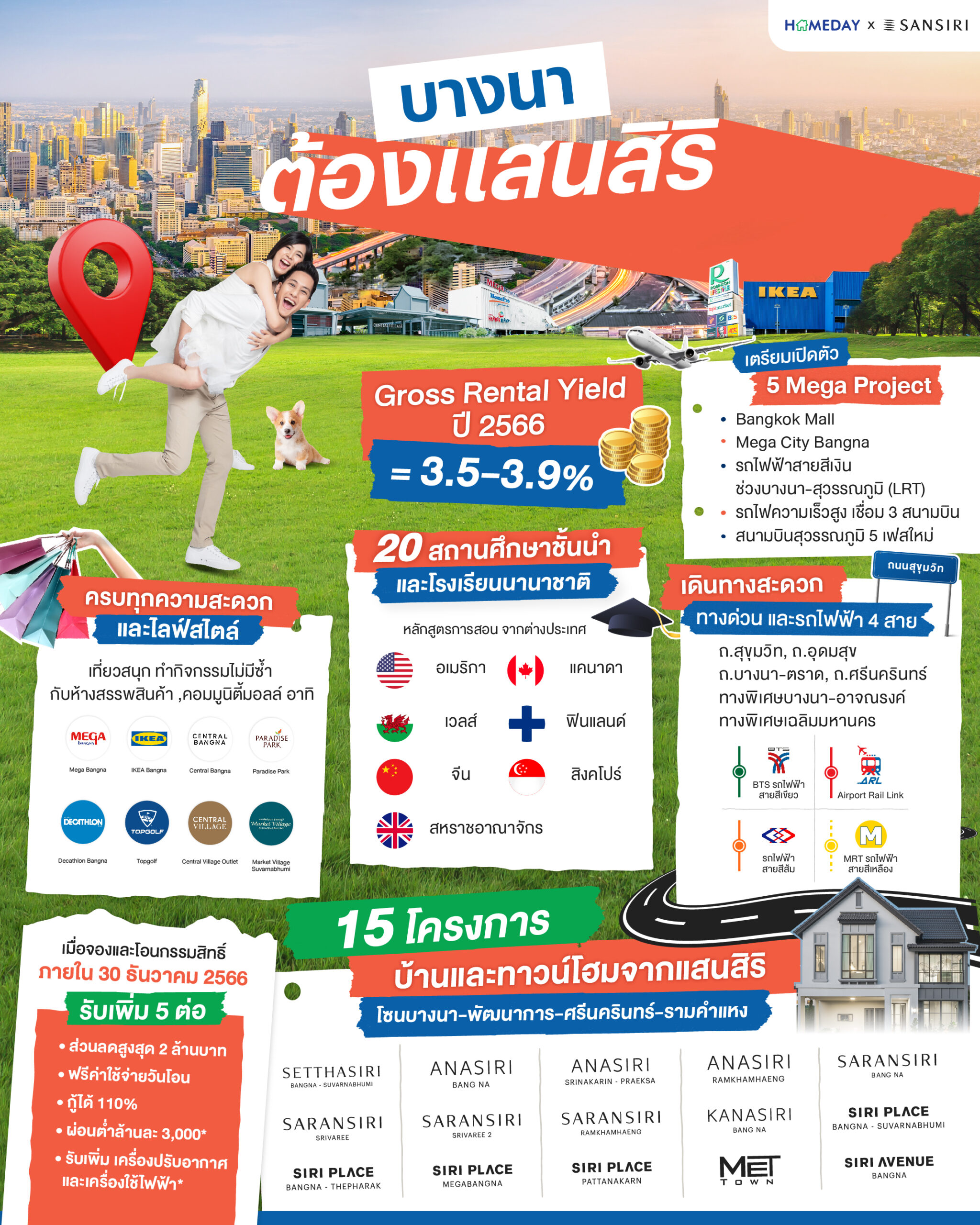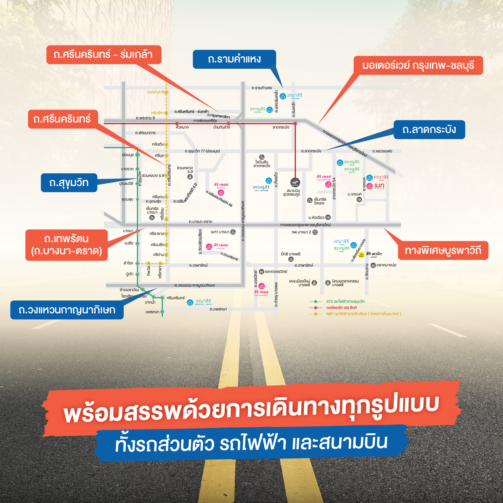 เริ่มต้นกันด้วยสิ่งอำนวยความสะดวกและแหล่งไลฟ์สไตล์ต่าง ๆ ในพื้นที่บางนากันก่อนเลยครับ เพราะนี่ถือเป็นหนึ่งในจุดขายของย่านที่โดดเด่นมากที่สุดเลยก็ว่าได้ ไม่ว่าคุณจะตามหาสิ่งไหนอยู่ ที่บางนามีพร้อมรองรับ ตอบโจทย์ความต้องการให้ผู้บริโภคได้ทุกรูปแบบ ทั้งมิกซ์ยูส, ห้างสรรพสินค้า, ศูนย์การค้า, ซุปเปอร์มาร์เก็ต, คอมมูนิตี้มอลล์, สถานที่ออกกำลังกาย และสวนสาธารณะ รวมกันแล้วมากกว่า 16 แห่ง ตัวอย่างบางส่วน ได้แก่ Decathlon Bangna, Little Walk Bangna, Att U Park Bangna, The Scene Town In Town, Paradise Park, IKEA Bangna, HABITO Mall, Central Bangna, Central Village Outlet, Market Village Suvarnabhumi, True Digital Park, Summer Hill, Mega Bangna, Topgolf, สนามลู่ปั่นจักรยานเจริญสุขมงคลจิต, สวนหลวง ร.9 ฯลฯ ยังไม่นับรวมกับโครงการใหม่ ๆ ที่กำลังจะเกิดขึ้นในอนาคต ดังนั้นบอกเลยว่ามีมากกว่า 16 แห่งนี้อย่างแน่นอนครับ