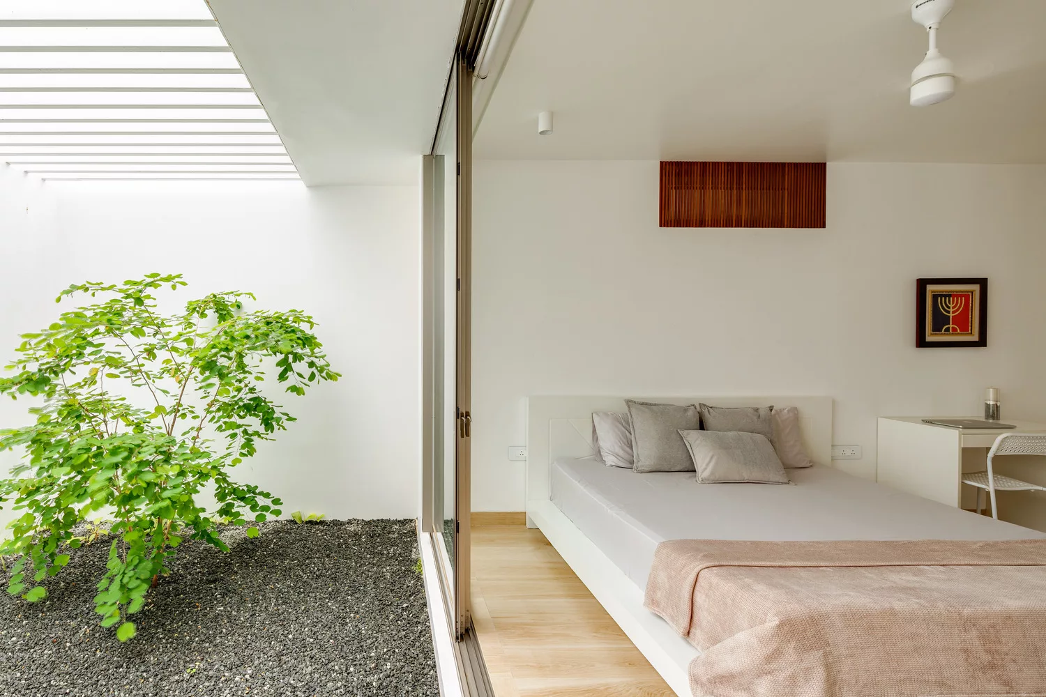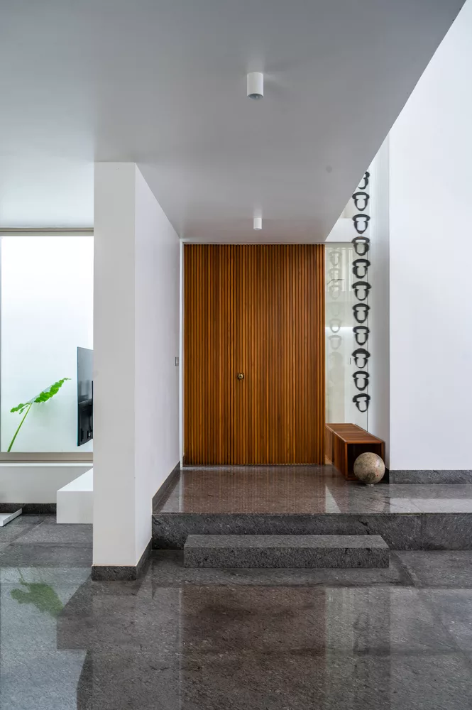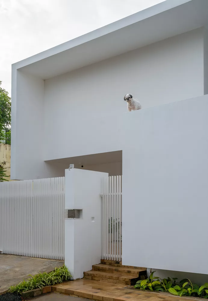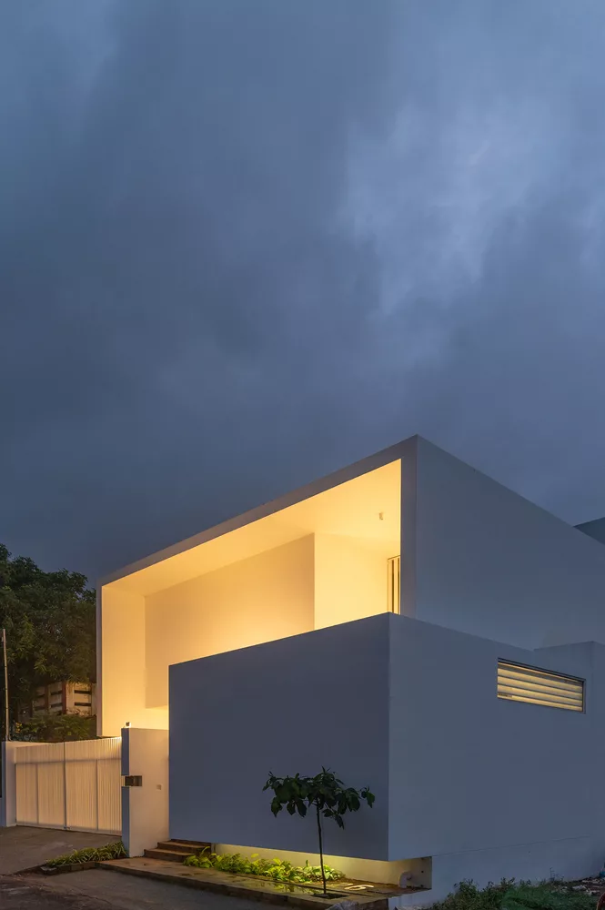 บ้านโมเดิร์นสองชั้นทรงกล่องหลังนี้ อยู่ในเมือง Tiruchirappalli, India นักออกแบบคือ LID architects โดยเจ้าของบ้านเป็นวิศวกรโยธา ซึ่งมีความรู้เชิงลึกในการก่อสร้าง จึงต้องการให้ออกแบบบ้านให้มีความสะดวกสบายที่สุด และประหยัดพลังงาน นักออกแบบจึงทำช่องเปิดขนาดใหญ่ที่ระดับพื้นดิน และหลังคาชั้น 1 เพื่อให้สามารถรับอากาศเย็นตอนกลางคืน พร้อมช่องระบายอากาศ เพื่อระบายอากาศร้อนในเวลากลางวัน และรักษาความเย็นที่ถูกดูดซับไว้ในเวลากลางคืน ได้หลีกเลี่ยงการมีหน้าต่างที่บริเวณรอบนอก โดยในช่วงกลางวัน อุณหภูมิภายในบ้านจะเย็นกว่าภายนอกบ้าน