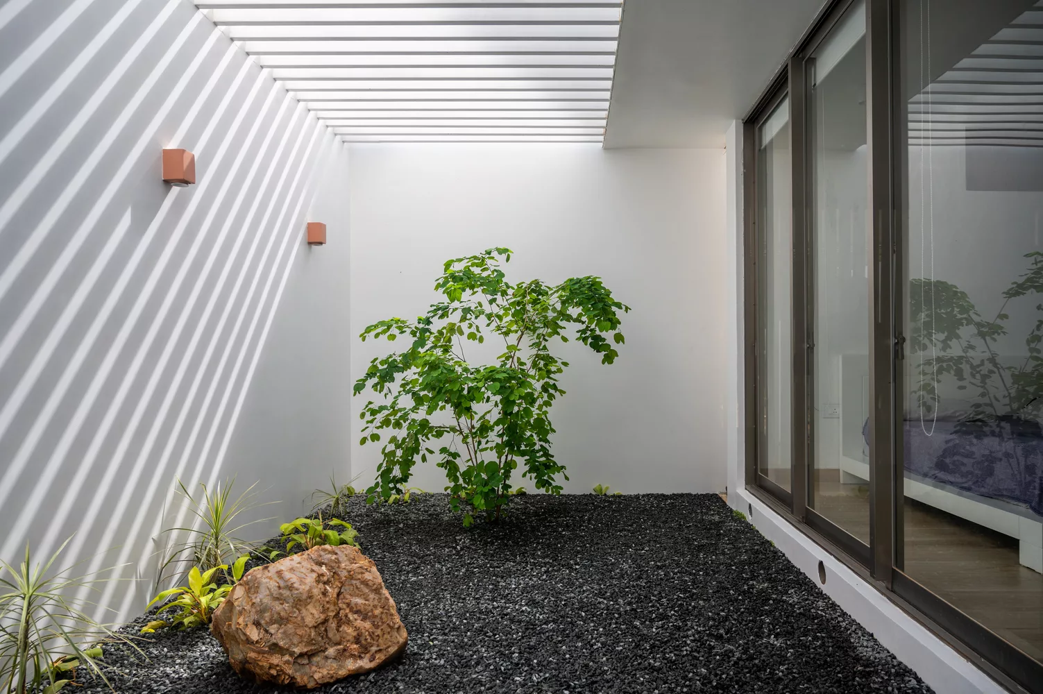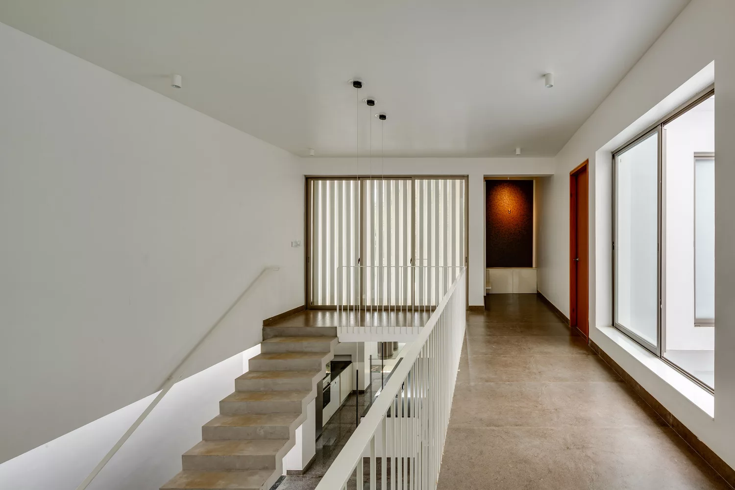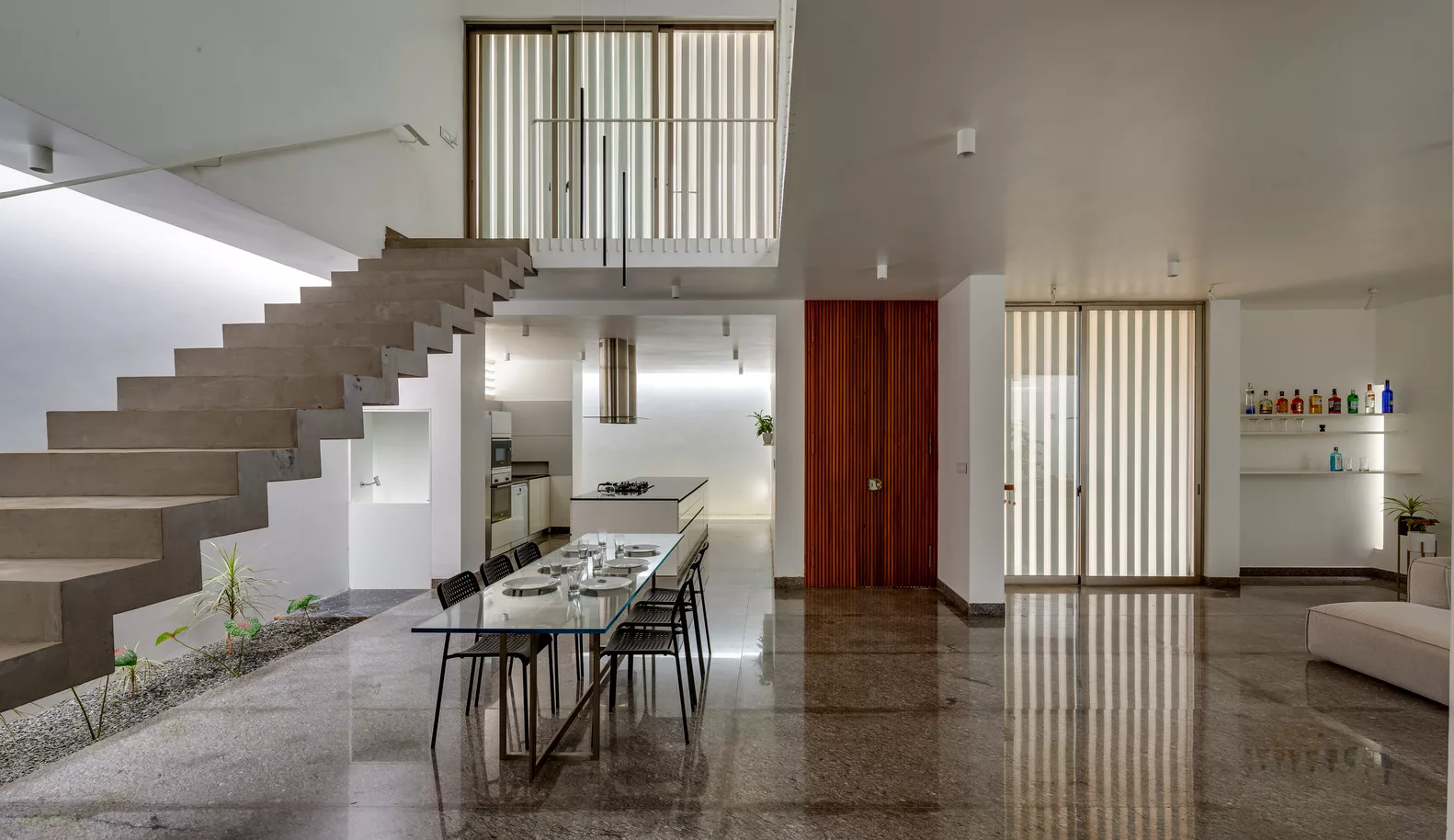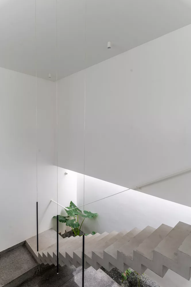 ห้องโถงภายในบ้าน จะค่อนข้างกว้างขวาง มีการจัดแบ่งพื้นที่ใช้สอยส่วนต่างๆ เอาไว้อย่างเป็นสัดส่วน บรรยากาศโปร่งสบาย ห้องครัวออกแบบสไตล์โมเดิร์น เลือกใช้อุปกรณ์เครื่องครัวที่ทันสมัย ภายในห้องนอน เน้นบรรยากาศแบบเปิดโล่ง เดินออกไปนอกประตูห้องนอน จะมีพื้นที่สวนหย่อมเล็กๆ ทำให้สามารถรับอากาศบริสุทธิ์ได้อย่างเต็มที่ และบันไดแบบปูนเปลือยดึงดูดสายตาเป็นอย่างมาก นอกจากนี้ยังออกแบบกำแพงเป็นช่องถี่ๆ ให้เล่นแสงในช่วงเวลากลางวันได้อย่างสวยงามเลยทีเดียว