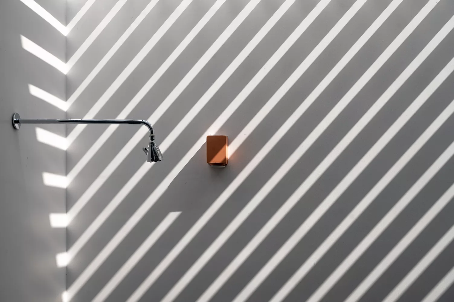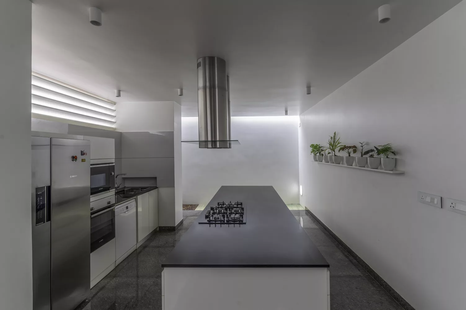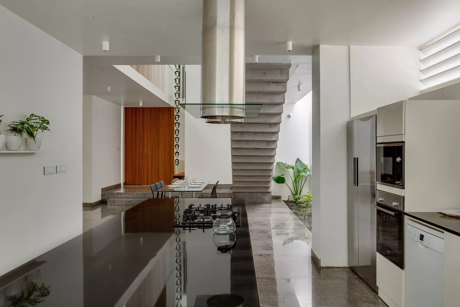 ห้องโถงภายในบ้าน จะค่อนข้างกว้างขวาง มีการจัดแบ่งพื้นที่ใช้สอยส่วนต่างๆ เอาไว้อย่างเป็นสัดส่วน บรรยากาศโปร่งสบาย ห้องครัวออกแบบสไตล์โมเดิร์น เลือกใช้อุปกรณ์เครื่องครัวที่ทันสมัย ภายในห้องนอน เน้นบรรยากาศแบบเปิดโล่ง เดินออกไปนอกประตูห้องนอน จะมีพื้นที่สวนหย่อมเล็กๆ ทำให้สามารถรับอากาศบริสุทธิ์ได้อย่างเต็มที่ และบันไดแบบปูนเปลือยดึงดูดสายตาเป็นอย่างมาก นอกจากนี้ยังออกแบบกำแพงเป็นช่องถี่ๆ ให้เล่นแสงในช่วงเวลากลางวันได้อย่างสวยงามเลยทีเดียว