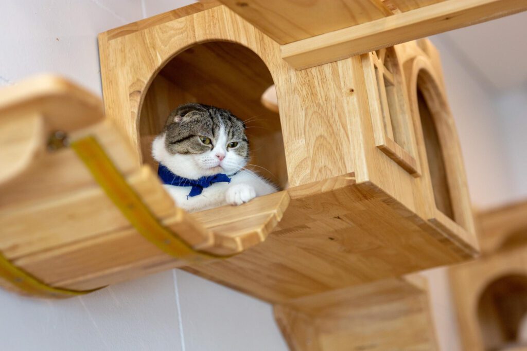 • จัดเตรียมที่หลบซ่อนหลายจุดในบ้าน เช่น กล่องที่มีทางเข้าออก, บ้านแมว, หรือชั้นวางของสูงๆ