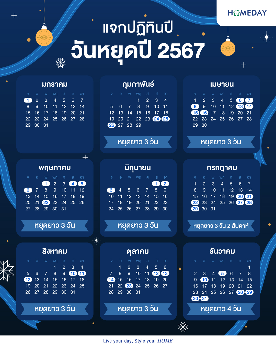 แจกปฏิทินปี 2567 มีใครกำลังเตรียมจดวันหยุดปี 2567 เตรียมแพลนทริปเที่ยว เตรียมแผนลาพักร้อนประจำปีกันอยู่บ้างครับ บอกเลยว่าปี 2567 นี้ วันหยุดชดเชยเพียบ เรียงคิวแน่น ๆ เลย ใครอยากไปไหนเตรียมตัวล่วงหน้ากันได้เลยครับ Homeday ทำ “ปฏิทินรวมวันหยุดปี 2567” มาให้ทุกท่านแล้ว แต่ละเดือนจะมีวันหยุดวันไหนบ้าง ไปดูกันครับ