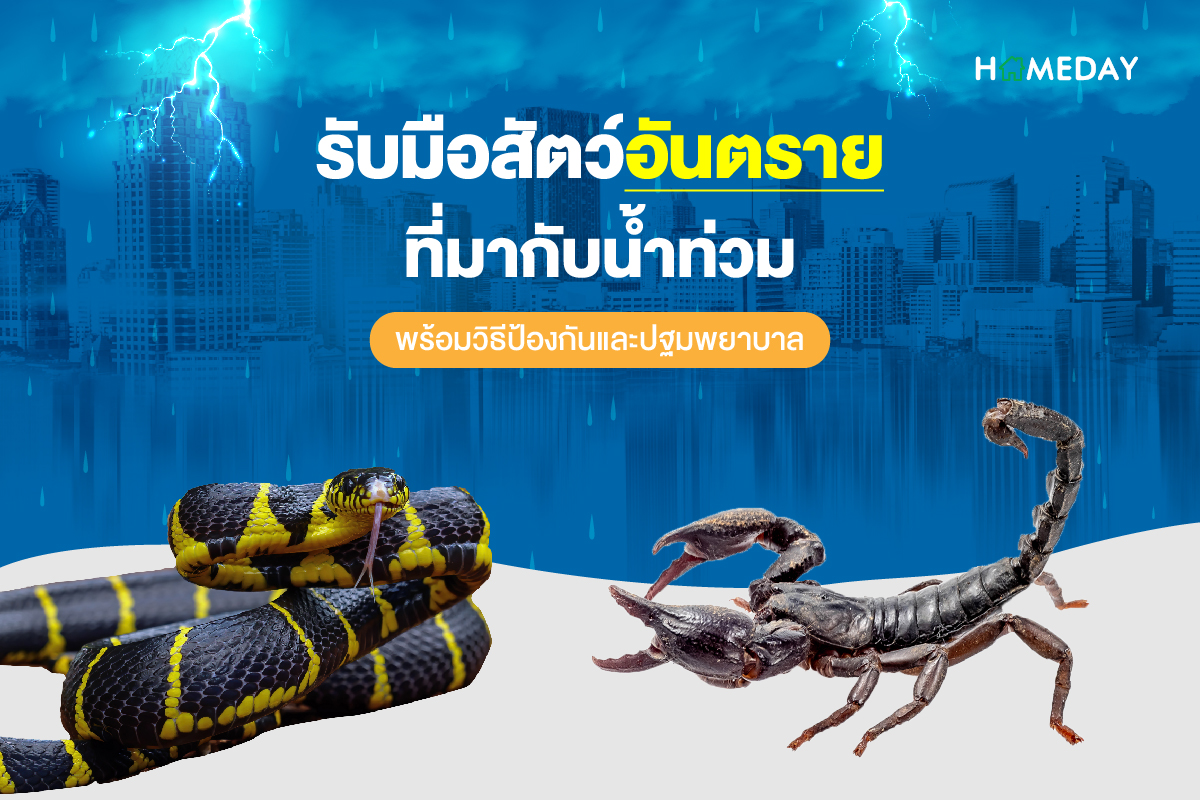 ช่วงนี้ฝนตกหนักต่อเนื่อง ทั่วกรุงเทพและปริมณฑล จนเกิดปัญหาน้ำรอระบาย ท่วมขังเข้าบ้านเรือนและชุมชนในหลายพื้นที่ แน่นอนว่าเมื่อน้ำท่วม นอกจากเศษขยะ เศษใบไม้ ที่พัดมาพร้อมกับน้ำแล้ว สัตว์ร้าย สัตว์อันตรายต่าง ๆ ก็มาพร้อมกับน้ำที่ท่วมขังเหล่านี้ด้วยเช่นกัน โดยสัตว์อันตรายที่เรามักจะโดนกัดกันมากที่สุดก็จะเป็นพวกแมงป่อง, ตะขาบ, งู และปลิง เนื่องจากพวกมันตัวเล็ก มองไม่เห็นได้ในน้ำ หรือบางตัวก็หนีน้ำ เข้ามาแอบซ่อนตัวอยู่ในบ้านของเรา จนเราเผลอเหยียบ หรือโดนพวกมันจู่โจมโดยไม่รู้ตัว วันนี้ Homeday เลยจะมาแนะนำวิธีรับมือกับสัตว์เหล่านี้ พร้อมวิธีป้องกันและรักษาให้ทุกคนได้เตรียมตัวรับมือกันเอาไว้ค่ะ