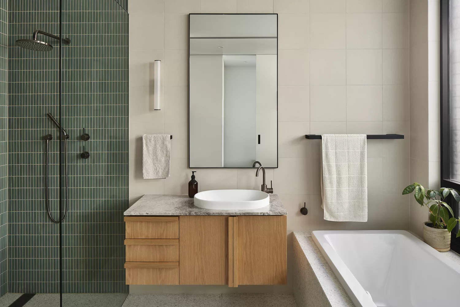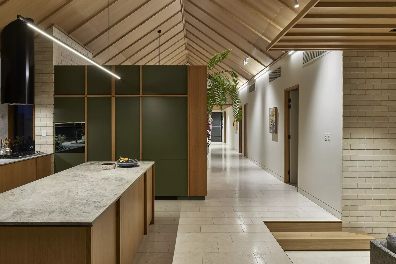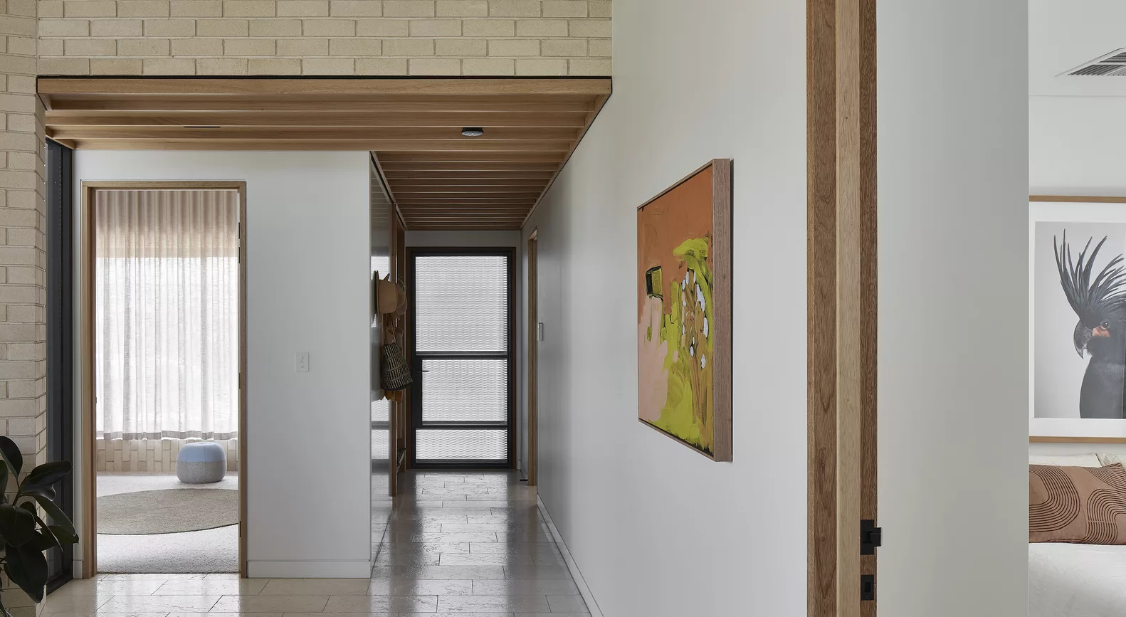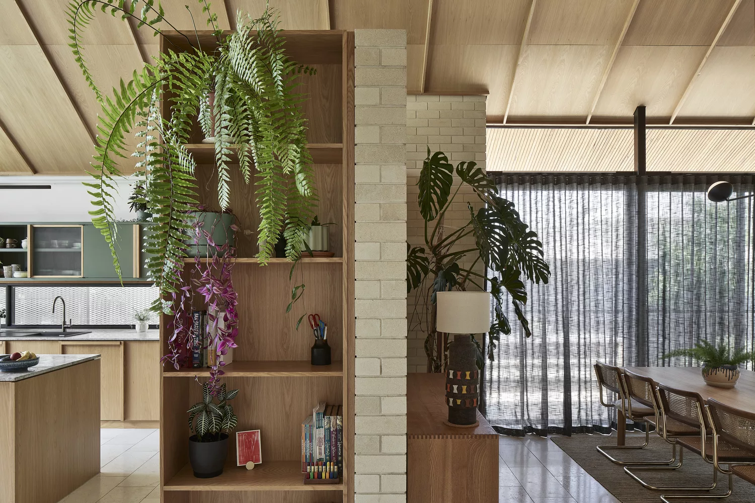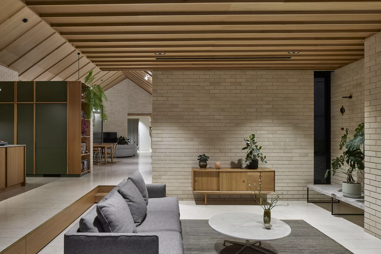 ภายในบ้าน มีการตกแต่งแบบโมเดิร์นเน้นความโปร่งสบาย ออกแบบให้เพดานยกสูง เลือกวัสดุจากไม้ ทำให้บรรยากาศภายในบ้านดูอบอุ่น มีการจัดสรรให้มีโซนนั่งเล่นทั้งภายใน และ ภายนอก ส่วนห้องครัวตกแต่งแบบเรียบง่ายจากเฟอร์นิเจอร์ไม้ด้วย ในส่วนของห้องน้ำมีพื้นที่รับแสงที่ค่อนข้างมาก เน้นใช้โทนสีขาว เข้ากับผนังในห้องอาบน้ำอย่างกระเบื้องสีเขียวเป็นอย่างมาก