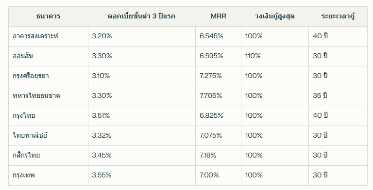 ในปี 2568 ธนาคารแต่ละแห่งมีการนำเสนออัตราดอกเบี้ยสินเชื่อบ้านที่แตกต่างกัน ทั้งในแง่ของอัตราดอกเบี้ย วงเงินกู้สูงสุด และระยะเวลาในการผ่อนชำระ ซึ่งผู้กู้จำเป็นต้องศึกษารายละเอียดให้ครบถ้วนก่อนตัดสินใจ มาดูอัตราดอกเบี้ยล่าสุดของแต่ละธนาคารกัน:
