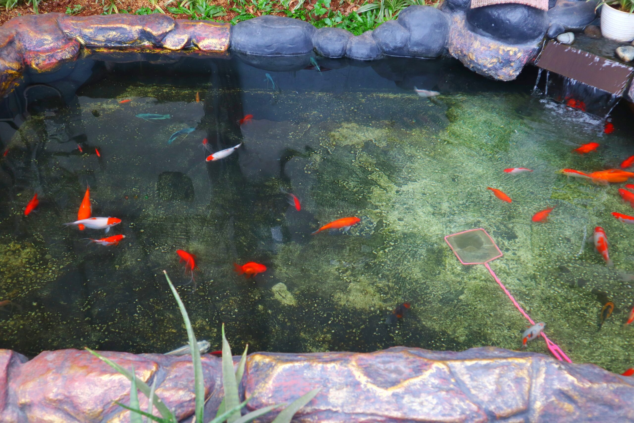 การตกแต่งบ่อปลาให้สวยงามไม่จำเป็นต้องใช้งบประมาณมาก โดยสามารถใช้หินที่เก็บมาจากธรรมชาติมาวางปิดขอบบ่อ หินกรวดซื้อมาเล็กน้อยเพื่อใส่ในบ่อสร้างความสวยงาม ส่วนหินทำน้ำตกสามารถหามาจากสวนบ้านหรือของเก่าที่มีอยู่แล้ว การใช้แผ่นทางเดินราคา 600 บาทจะช่วยเพิ่มความสวยงามรอบบ่อ