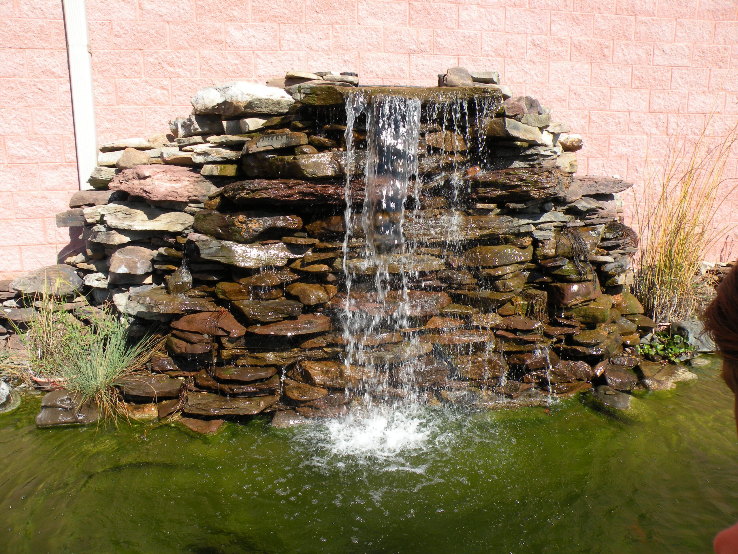 ขั้นตอนต่อมาคือการก่อผนังด้านหลังด้วยอิฐบล็อก โดยสามารถเลือกใช้วัสดุอื่นได้ตามความสะดวก การเดินท่อน้ำให้เรียบร้อยและแบ่งท่อให้น้ำไหลได้ทั่วทั้งม่านน้ำตกเป็นสิ่งสำคัญ