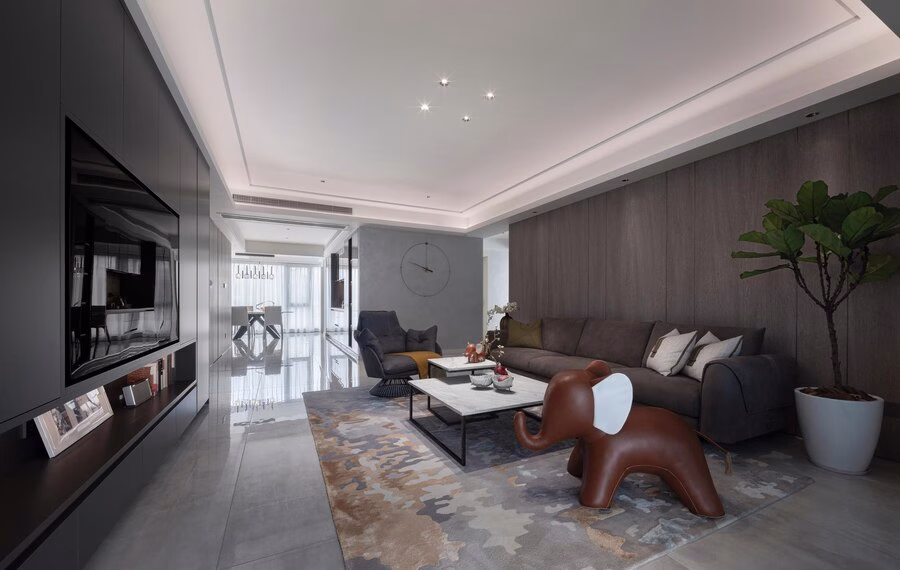 สำหรับโซฟา ควรเลือกแบบที่มีรูปทรงเรียบง่าย อาจเป็นโซฟาทรงตรงหรือทรงโค้งก็ได้ แต่ควรเน้นความเรียบและมีเส้นสายที่ชัดเจน โต๊ะกลางควรเป็นรูปทรงเรขาคณิตที่เรียบง่าย เช่น ทรงสี่เหลี่ยม วงกลม หรือหกเหลี่ยม ทำจากวัสดุที่ให้ความรู้สึกร่วมสมัย เช่น ไม้ กระจก หรือโลหะ