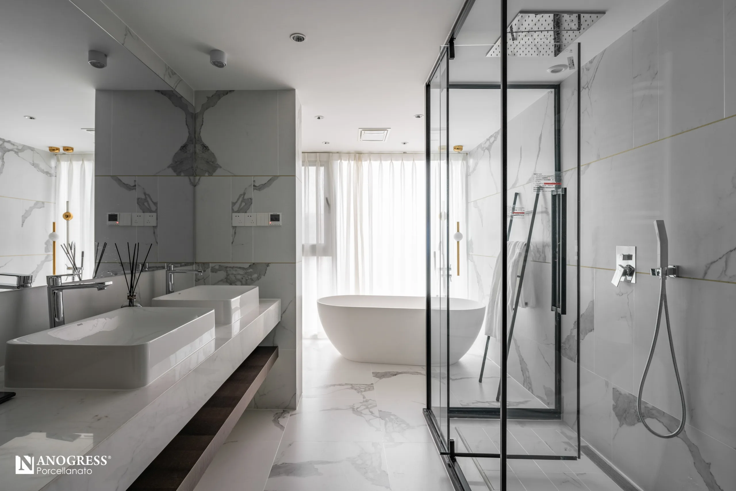 การใช้กระเบื้องแผ่นใหญ่ยังช่วยลดรอยต่อ ทำให้พื้นที่ดูต่อเนื่องและกว้างขึ้น นอกจากนี้ การปูกระเบื้องจากพื้นจรดเพดานจะช่วยให้เกิดภาพลวงตาว่าห้องมีพื้นที่มากกว่าความเป็นจริง หากต้องการใช้กระเบื้องลวดลาย ควรเลือกลวดลายในแนวตั้งเพื่อให้ห้องดูสูงขึ้น หรือลายในแนวนอนเพื่อให้ห้องดูกว้างขึ้น