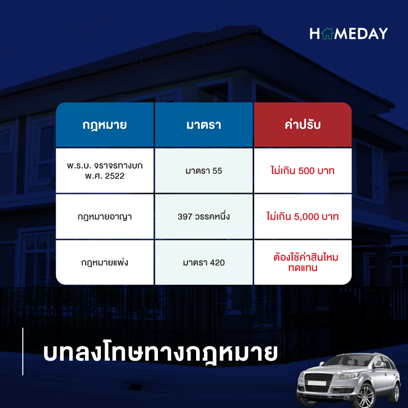 จะเห็นได้ว่าจากข้อที่ 6 หยุดรถ หรือ จอดรถ ตรงปากทางเข้าออกของอาคาร หรือ ทางเดินรถ และข้อที่ 8 หยุดรถ หรือ จอดรถ ในลักษณะที่กีดขวางทางจราจร เป็นลักษณะที่ตรงกับการจอดรถหน้าบ้านนั่นเองค่ะ เพราะไม่ว่าจะเป็นถนนในหมู่บ้าน หรือบริเวณหน้าบ้านของตัวเอง ก็ถือว่าตรงกับคุณลักษณะที่กล่าวไปข้างต้นทั้งสิ้น