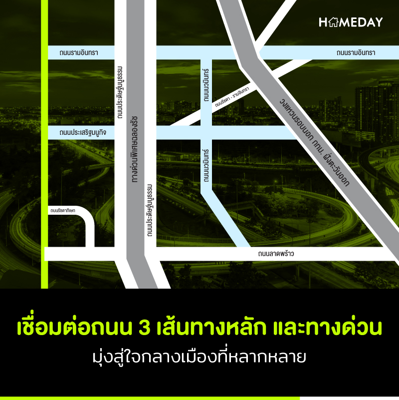 ตัวถนนสายหลัก สามารถเชื่อมเข้าสู่ใจกลางเมืองได้ใกล้ ทั้งโซน New CBD อย่างพระราม 9-รัชดาภิเษก ย่านไลฟ์สไตล์อย่างรัชโยธิน-บางกะปิ-ลาดพร้าว และเป็นทำเลทางลัดทางผ่าน เชื่อมต่อย่านลาดพร้าวกับรามอินทรา ทั้งยังใกล้จุดขึ้น-ลงทางด่วน อาจณรงค์-รามอินทรา และอยู่ใกล้กับแนวรถไฟฟ้าหลากหลายสาย จึงไม่น่าแปลกใจที่ทำเลนี้ จะเป็นที่ชื่นชอบของใครหลายคนครับ