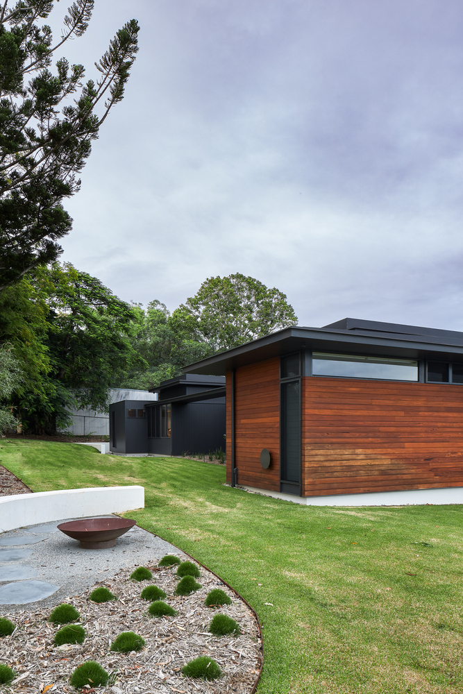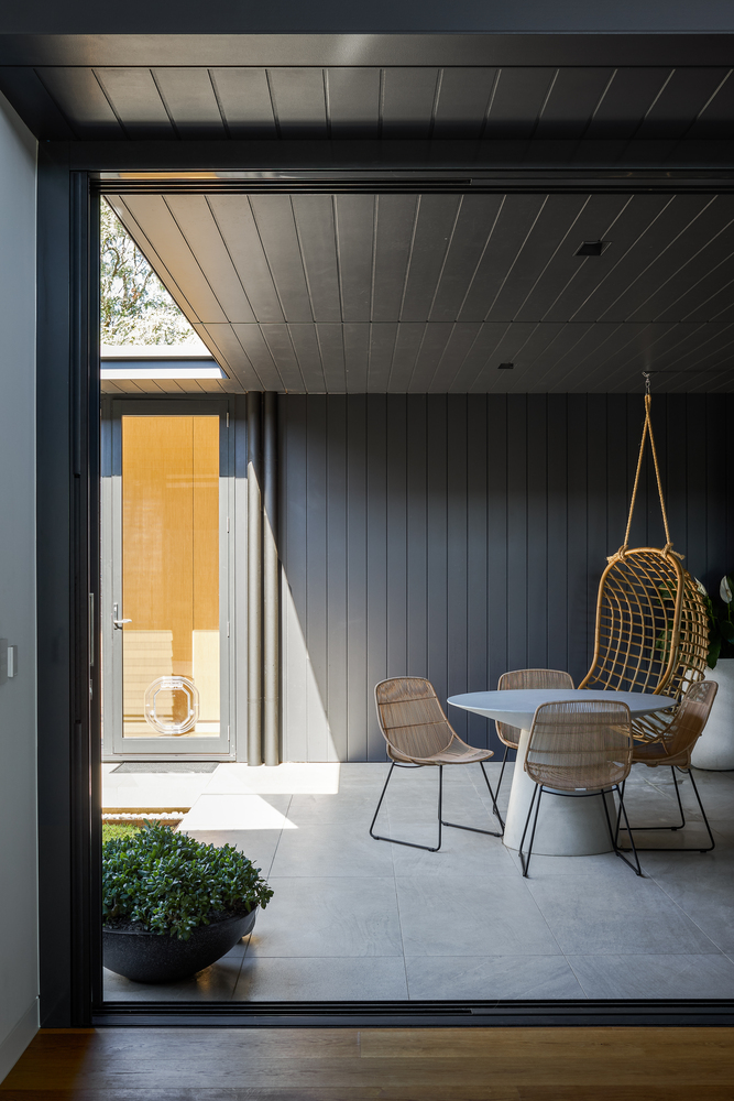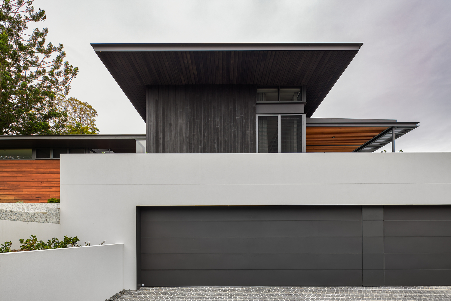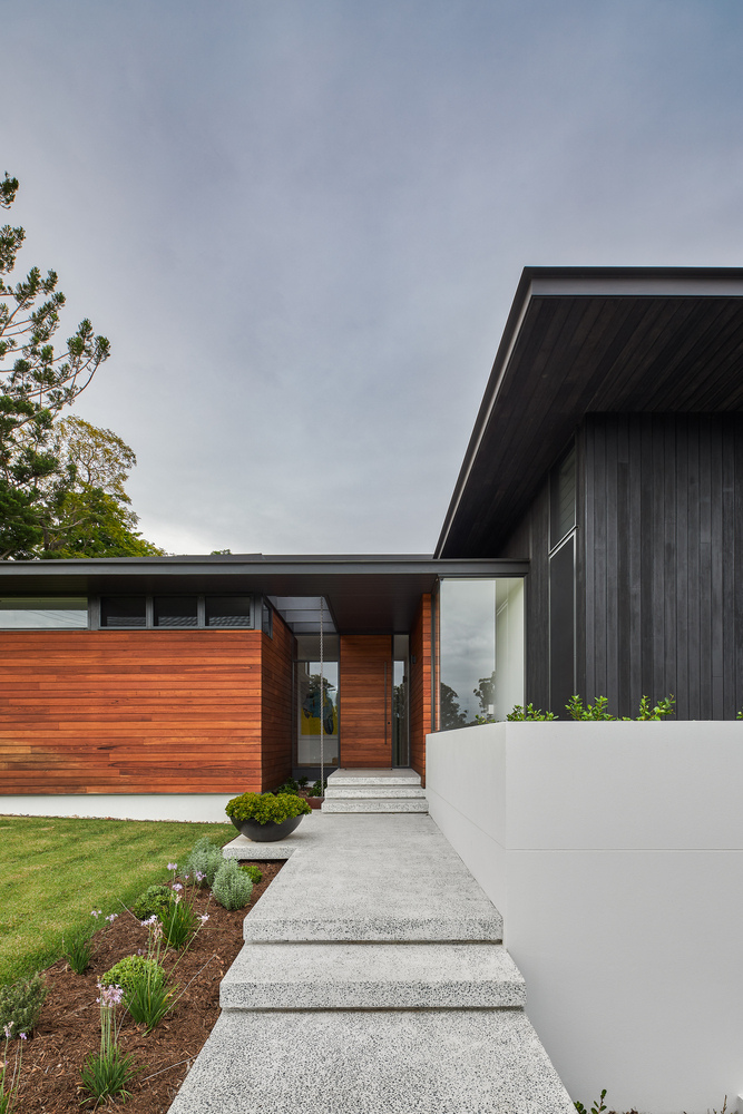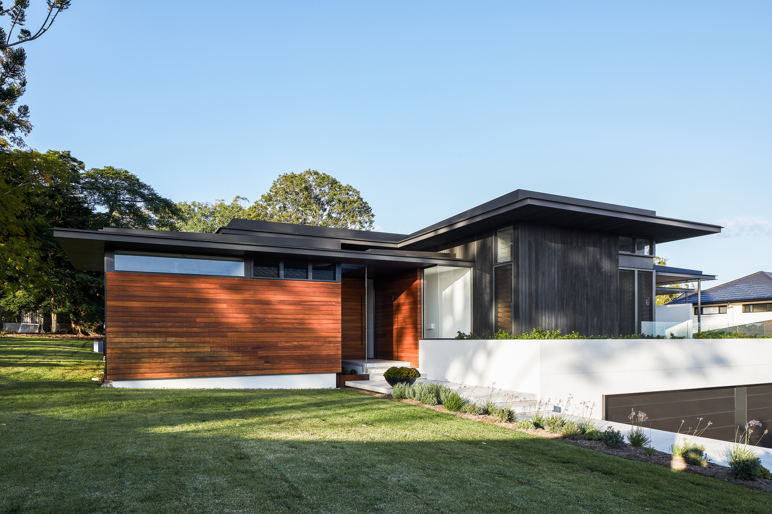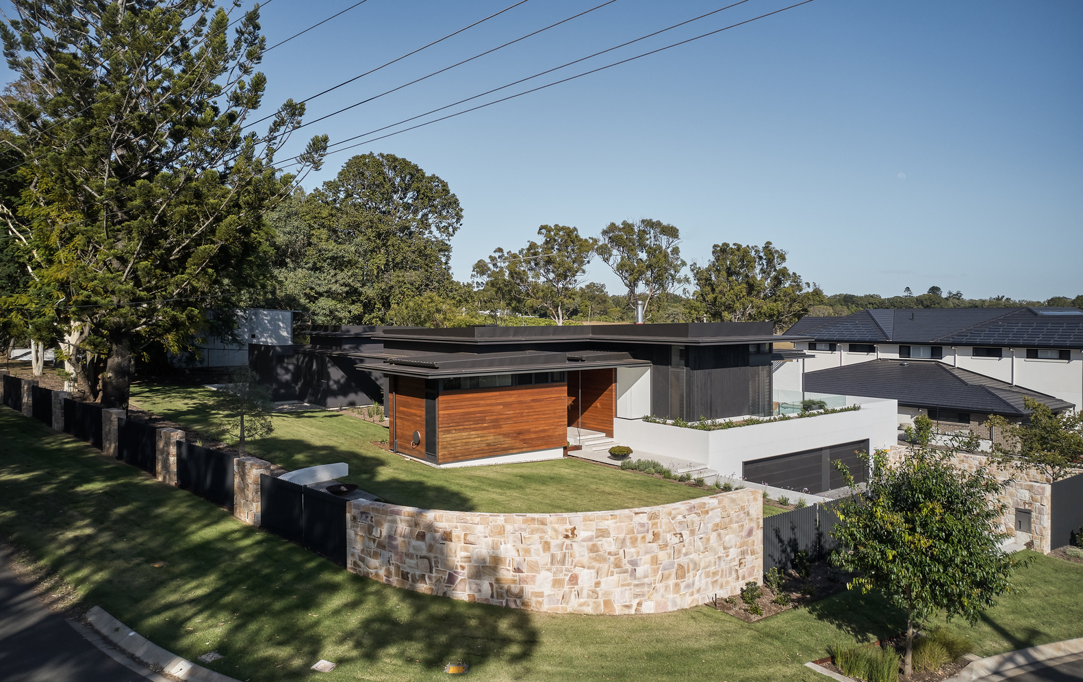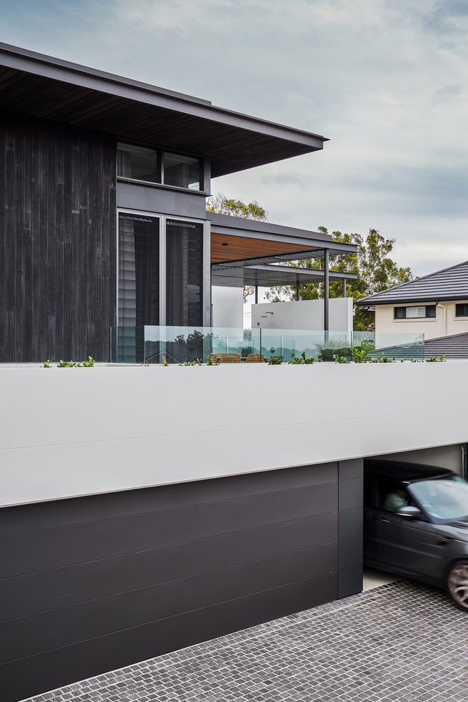 ไอเดียแต่งบ้านหลังนี้เป็นผลงานจากสถาปนิก Alexandra Buchanan Architecture จากประเทศออสเตรเลีย เป็นบ้านมุมแนวโมเดิร์นร่วมสมัย ตกแต่งด้วยโทนสีดำเป็นหลัก เติมแต่งด้วยไม้ระแนงสีเข้มตัดกับสนามหญ้าเขียวขจีบริเวณรอบๆ ได้อย่างลงตัว โรงจอดรถใต้ดินเป็นประตูอัตโนมัติ และปิดทึบ จัดเก็บยานพาหนะคู่ใจแบบปลอดภัย