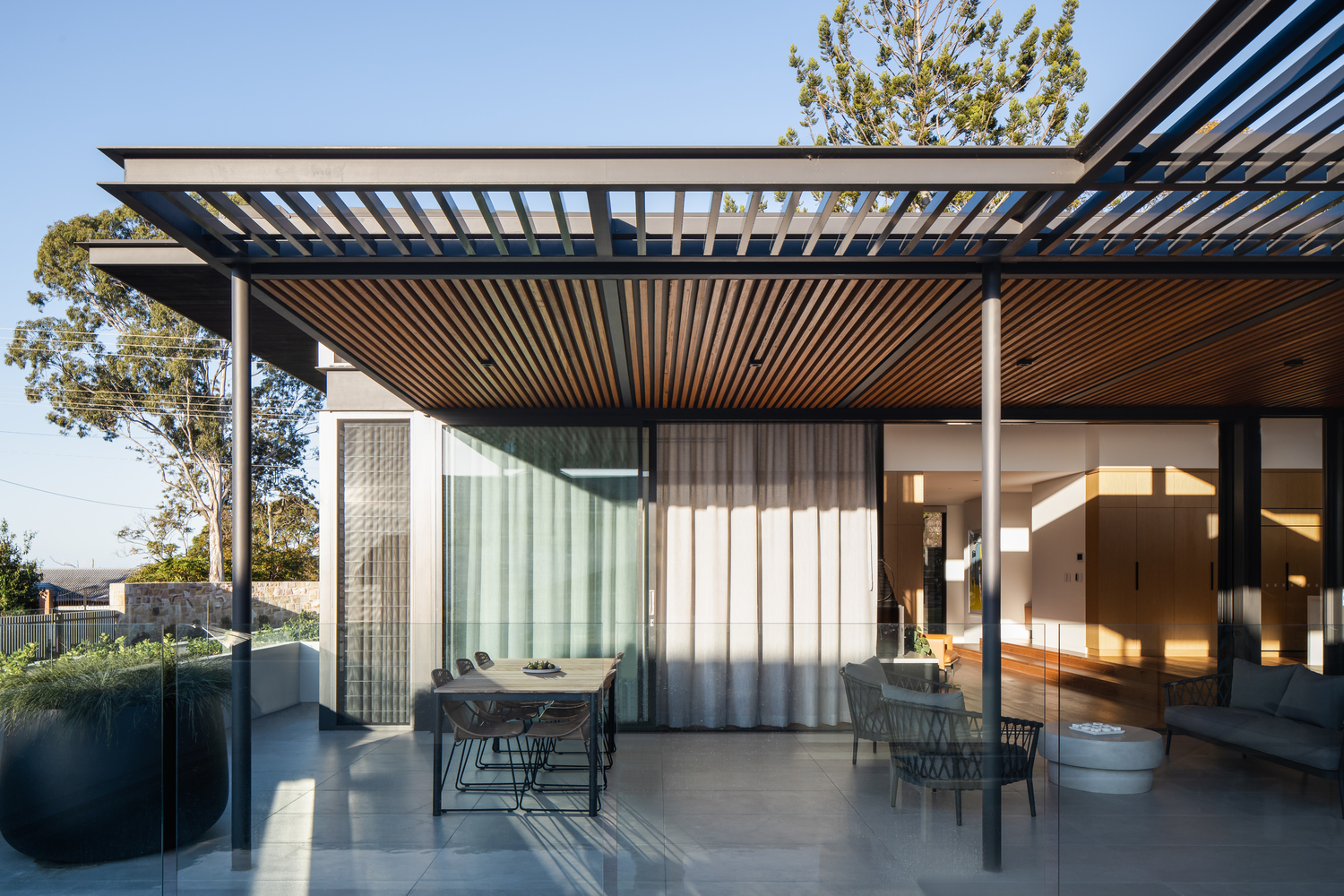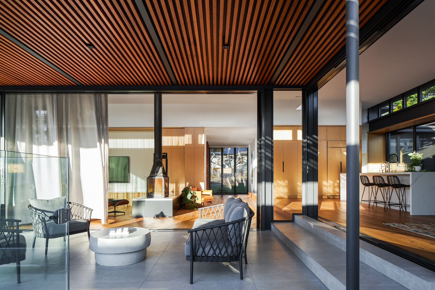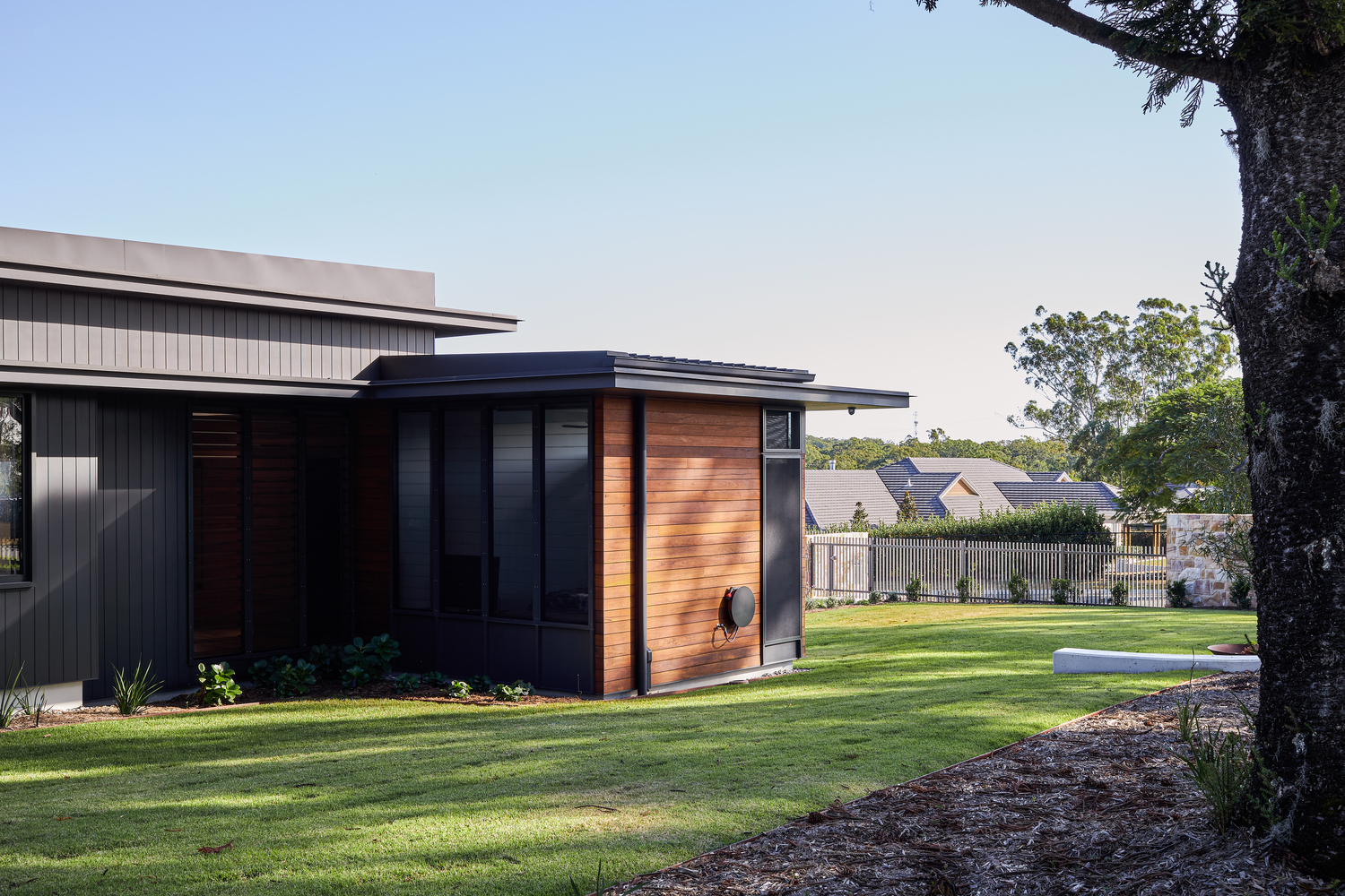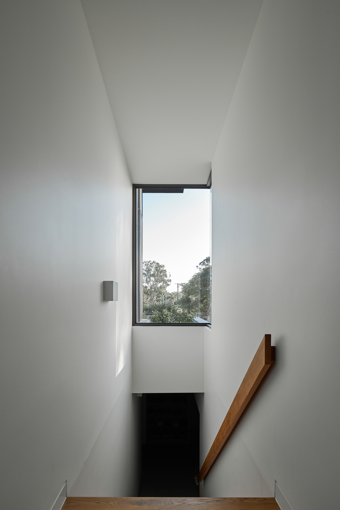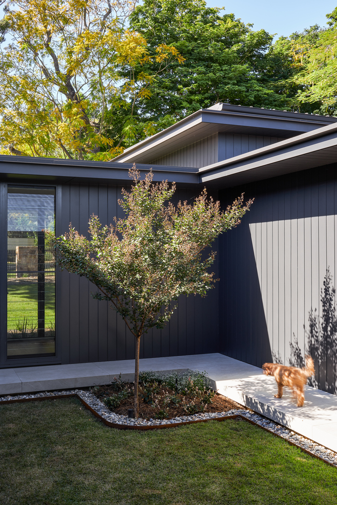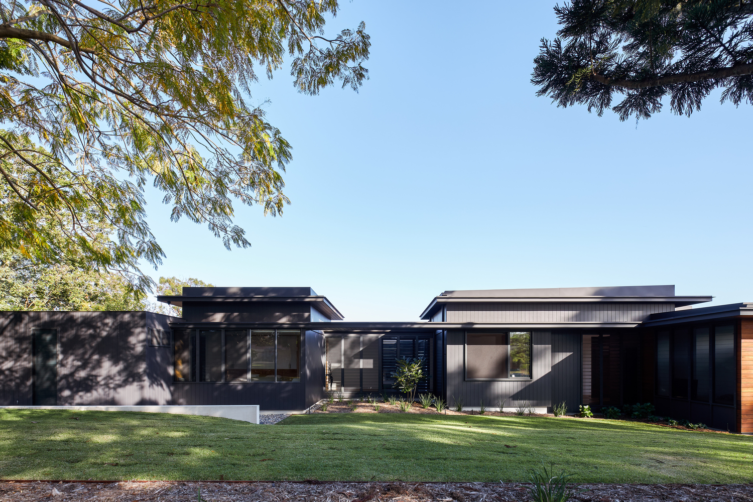 ไอเดียแต่งบ้านหลังนี้เป็นผลงานจากสถาปนิก Alexandra Buchanan Architecture จากประเทศออสเตรเลีย เป็นบ้านมุมแนวโมเดิร์นร่วมสมัย ตกแต่งด้วยโทนสีดำเป็นหลัก เติมแต่งด้วยไม้ระแนงสีเข้มตัดกับสนามหญ้าเขียวขจีบริเวณรอบๆ ได้อย่างลงตัว โรงจอดรถใต้ดินเป็นประตูอัตโนมัติ และปิดทึบ จัดเก็บยานพาหนะคู่ใจแบบปลอดภัย