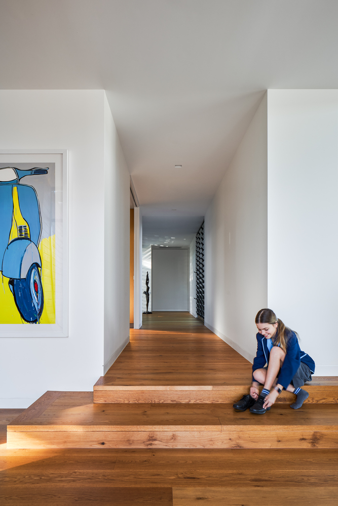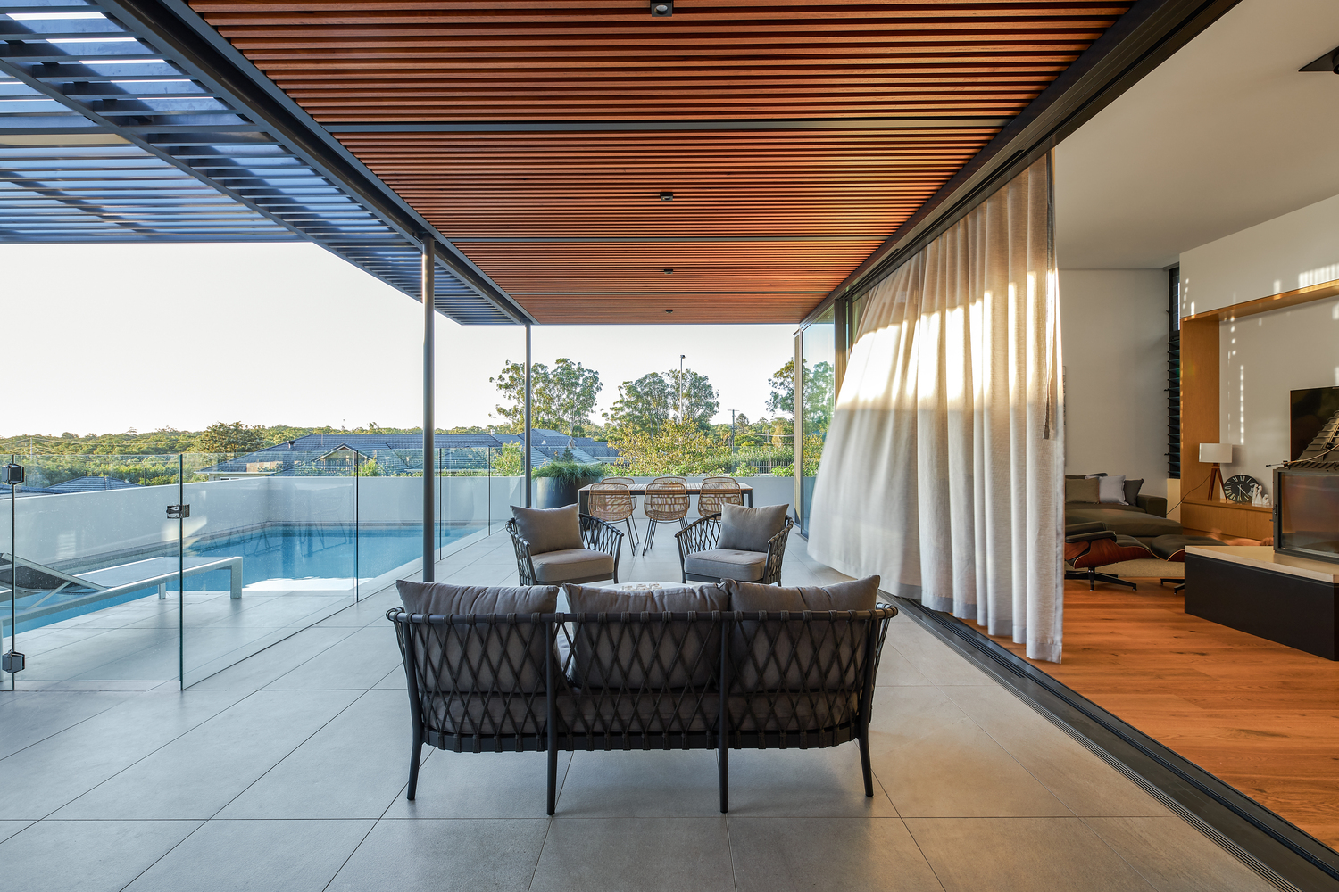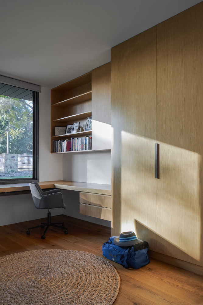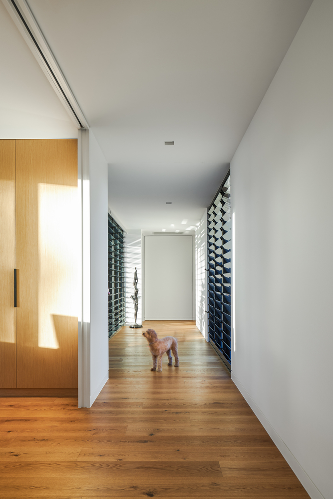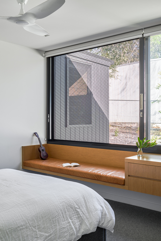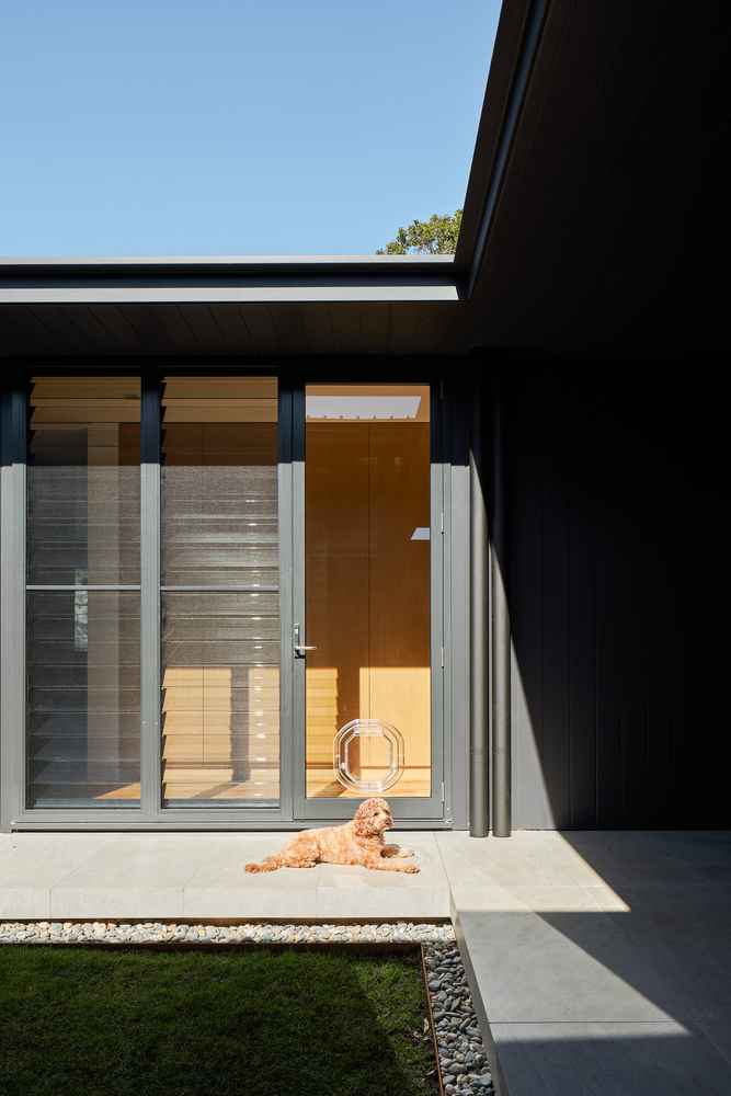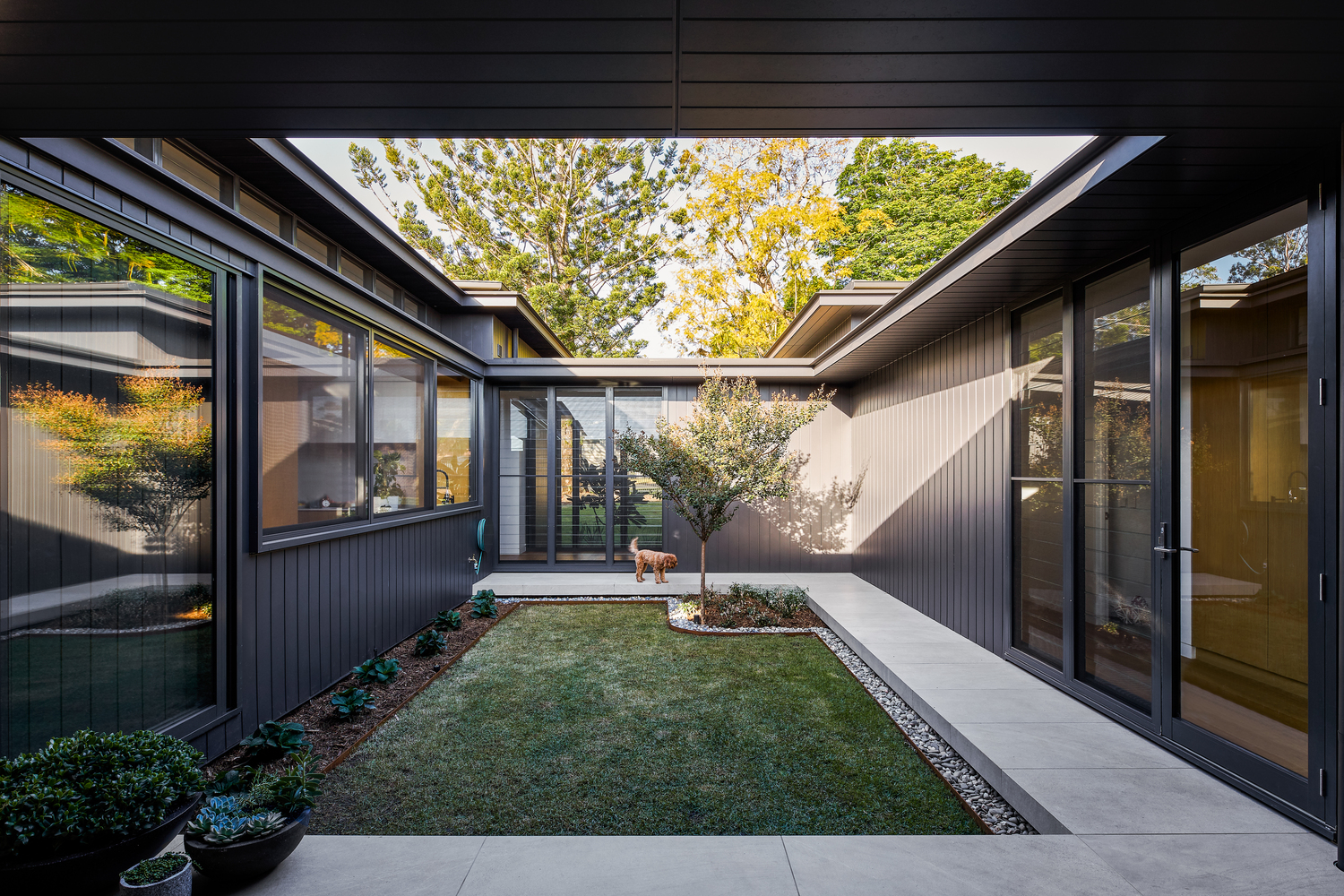 ไอเดียแต่งบ้านหลังนี้เป็นผลงานจากสถาปนิก Alexandra Buchanan Architecture จากประเทศออสเตรเลีย เป็นบ้านมุมแนวโมเดิร์นร่วมสมัย ตกแต่งด้วยโทนสีดำเป็นหลัก เติมแต่งด้วยไม้ระแนงสีเข้มตัดกับสนามหญ้าเขียวขจีบริเวณรอบๆ ได้อย่างลงตัว โรงจอดรถใต้ดินเป็นประตูอัตโนมัติ และปิดทึบ จัดเก็บยานพาหนะคู่ใจแบบปลอดภัย