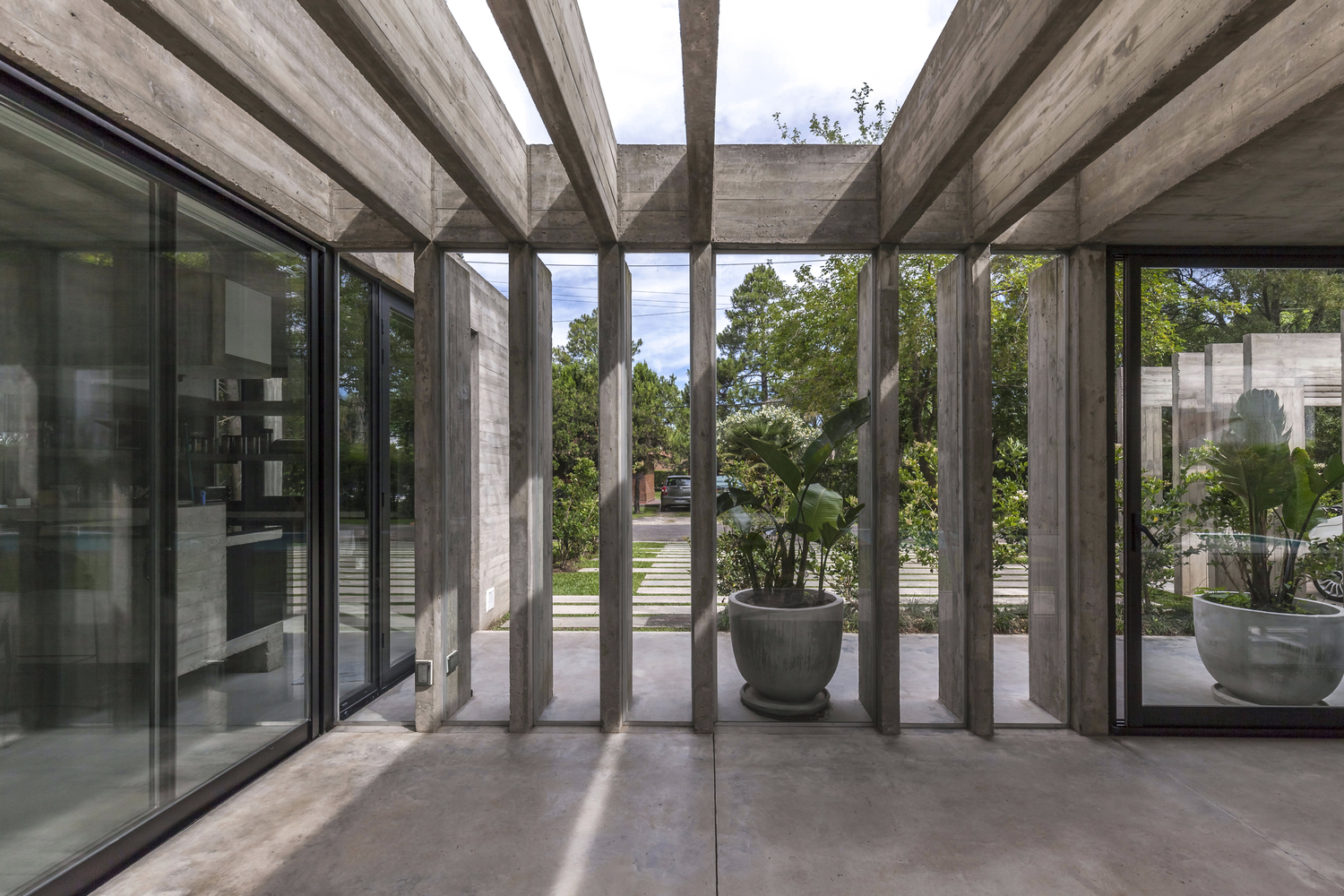 ในส่วนพื้นที่แบบกึ่งเอาท์ดอร์หน้าบ้าน ทำเป็นพาร์ทิชันคอนกรีตพร้อมใส่ความเป็นส่วนตัวให้ตัวบ้าน ในขณะที่ยังมองเห็นพื้นที่สาธารณะด้านนอก และรับแสงสว่างได้เช่นเดิม เพื่อที่จะได้ใกล้ชิดธรรมชาติ และกลมกลืนกันเป็นหนึ่งเดียวนั้น ได้มีการติดตั้งกระจกใสบานใหญ่เอาไว้เป็นกำแพง เพียงแค่เลื่อนเปิดก็จะพบกับอากาศที่สดชื่นได้ตลอดเวลาที่ต้องการ นอกจากนี้ภายในยังออกแบบให้เป็น Open space เพิ่มความรู้สึกพิเศษให้กับพื้นที่ เติมการไหลเวียนอากาศแล้ว ยังมีการเพิ่มระยะจากพื้นถึงฝ้าแบบ Double space ยังเป็นการเชื่อมต่อทางสายตาระหว่างพื้นที่บ้าน ทำให้ได้รับวิวสวนที่เต็มไปด้วยต้นไม้สูงสง่าได้แบบจุใจ