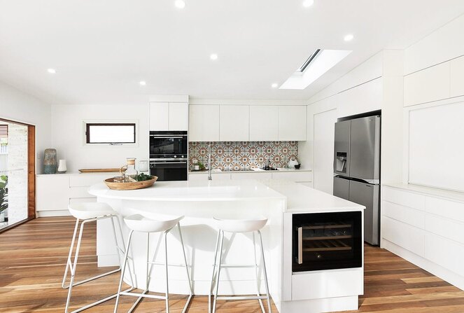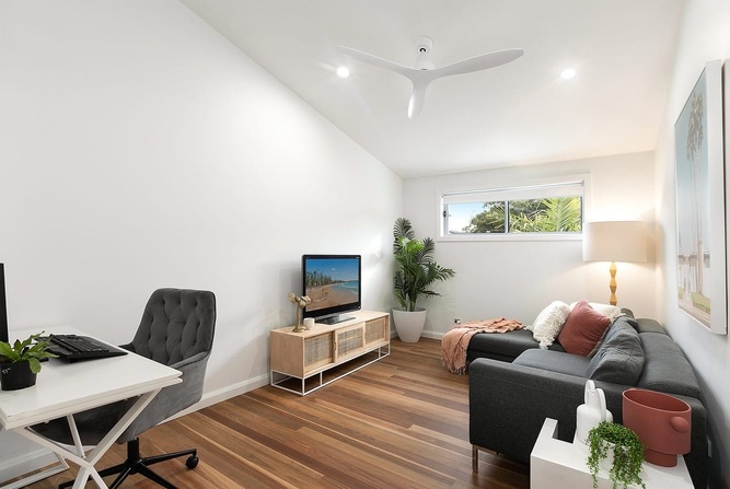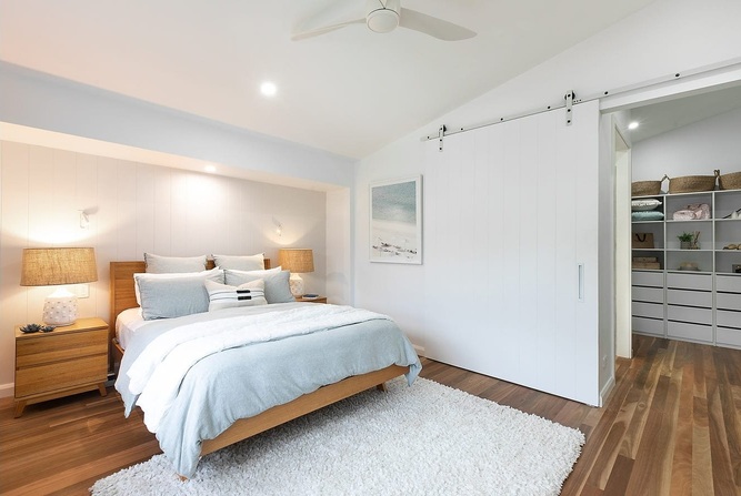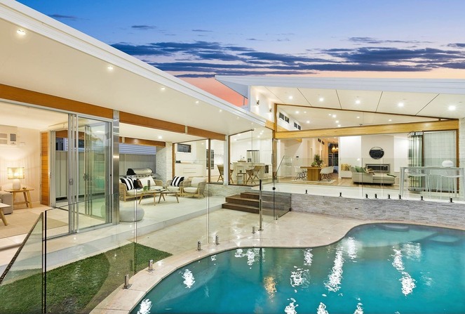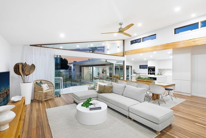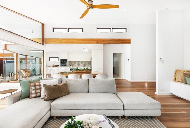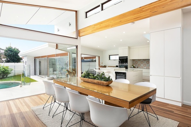 เข้ามาดูการตกแต่งภายในบ้านพื้นที่ห้องนั่งเล่นส่วนมากจะเน้นใช้กระจกใสตกแต่งเป็นหลัก ไม่ว่าจะเป็นหน้าต่าง หรือบานประตู ซึ่งเป็นตัวช่วยทำให้ภายในบ้านมีแสงสว่างสาดส่องเข้ามาได้ตลอดวัน อีกทั้งยังช่วยทำให้บ้านมีอากาศถ่ายเทสะดวก โดยรวมเฟอร์นิเจอร์จะใช้โทนสีสว่างๆ และสีน้ำตาลจากไม้ตกแต่งเป็นหลัก ส่วนห้องครัวบิวท์อินตู้เก็บของและเคาน์เตอร์เป็นสีขาวสะอาดสะอ้าน ต่อไปที่ห้องนอนได้ออกแบบติดตั้งประตูบานเลื่อนบานใหญ่ เอาไว้กั้นห้องนอนกับห้องน้ำได้อย่างเป็นสัดส่วน นอกจากนี้เจ้าของบ้านยังได้สร้างสระว่ายน้ำขนาดเล็ก ออกแบบขอบสระให้มีเว้าเล็กน้อย เพื่อความเป็นมินิมอล ที่สำคัญสระว่ายน้ำยังมีส่วนช่วยทำให้บ้านร่มเย็นได้ดีเลยทีเดียว
