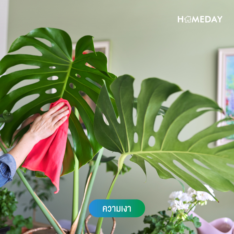 สิ่งที่ไม่ควรพลาดเลยก็คือ ความเงาของใบค่ะ เพราะมอนสเตอร่าเป็นพืชใบที่ใช้ใบของตัวเองโชว์ความสวยงาม ดังนั้นควรใช้ผ้าชุบน้ำ หรือที่นิยมกันก็คือ น้ำมันมะกอก มาเช็ดใบเพื่อกำจัดคราบฝุ่นที่เกาะตามใบ และยังทำให้ใบดูเงางามอยู่เสมออีกด้วยค่ะ