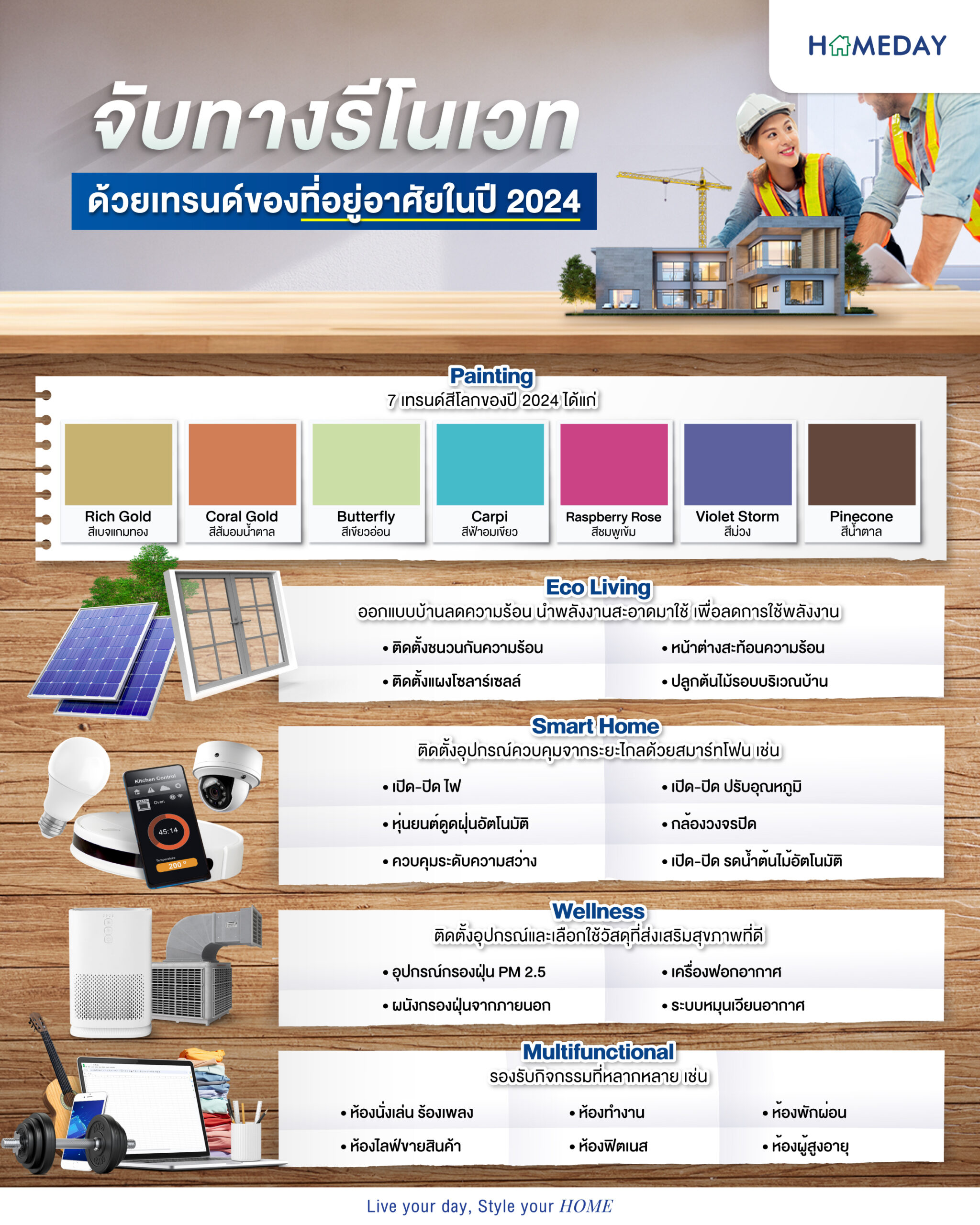 เทรนด์การชุบชีวิตใหม่ให้บ้านเริ่มเป็นที่สนใจมากขึ้นสำหรับเจ้าของบ้านที่ต้องการมองหาความแปลกใหม่ให้กับบ้านที่พักอาศัยบางคนอาจจะเพียง 2-3 ปีถึงจะรีโนเวทสักครั้ง แต่สำหรับบางคนก็เกือบจะเข้าสู่ปีที่ 10 ถึงเริ่มลงมือกัน แต่ไม่ว่าเวลาจะผ่านไปแค่ไหน การลุกขึ้นมาทำอะไรใหม่ ๆ ก็ทำให้ชีวิตสดใสได้เหมือนกัน รีโนเวทบ้านในแต่ละครั้ง ทำไมถึงต้องวางแผนให้ดีก่อน เพราะการวางแผนจะทำให้ได้บ้านในเวอร์ชั่นใหม่ตามที่คิดไว้ และ เป็นไปในวงเงินที่กำหนด ไม่ปานปลายอย่างที่ใครหลายคนกังวล แรกเริ่มเลยควรกำหนดธีมที่ชอบ จากนั้นให้ลุยสร้างภาพจากกระดาษร่างแบบแล้วทำให้ทุกอย่างกลายเป็นจริงขึ้นมา ส่วนธีมของบ้านใหม่หลังรีโนเวทแล้วจะเป็นแบบไหนนั้น ลองดูเทรนด์ของที่อยู่อาศัยในปี 2024 ว่ามีอะไรบ้าง