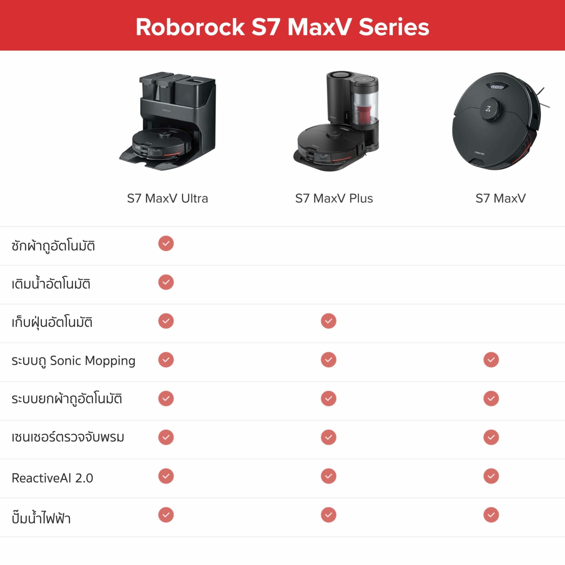 และนี่ก็เป็นหุ่นยนต์ดูดฝุ่น พร้อมกล้องและไมค์ในตัว Roborock S7 MaxV Series ทั้ง 3 รุ่น ที่เรานำมาฝากกันในวันนี้ค่ะ หวังว่าจะสามารถช่วยให้ทุกคนตัดสินใจเลือกซื้อได้ง่ายขึ้นนะคะ ตัวเครื่องและตัวแท่น Dock ทุกรุ่น มีขายแยกกันทุกชิ้นเลย ถ้าอยากลองทดสอบความสามารถก่อน ก็ซื้อเฉพาะตัวเครื่องเดี่ยว ๆ มาลองก่อนก็ได้ค่ะ ตัวเครื่องรับประกัน 3 ปีเต็ม น่าจะเป็นเจ้าที่รับประกันนานสูงที่สุดในไทยเลยค่ะ หากหมดระยะเวลาประกันก็ไม่ต้องกังวลนะคะ ที่ไทยมีศูนย์ซ่อมคอยดูแลให้บริการอยู่ ได้อะไหล่แท้จากทางแบรนด์แน่นอน
