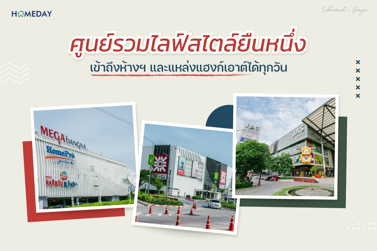 ศูนย์รวมไลฟ์สไตล์ยืนหนึ่ง เข้าถึงห้างฯ และแหล่งแฮงก์เอาต์ได้ทุกวัน ใครที่ชอบเดินห้างฯ รักในการชอปปิง ชอบหาร้านอาหาร ร้านคาเฟ่ สำหรับแวะไปนั่งชิล อยากอยู่รายล้อมแหล่งแฮงก์เอาต์ ไลฟ์สไตล์มอลล์ต่าง ๆ ทำเล “สุขุมวิท-บางนา” คือที่สุดของการตอบโจทย์ในเรื่องนี้แล้วล่ะครับ ที่นี่เรียกได้ว่าเป็นย่านหนึ่งของกรุงเทพฯ ที่มีห้างสรรพสินค้าและศูนย์การค้า อยู่รวมกันมากที่สุดเลยก็ว่าได้ เพราะแม้แต่ผู้คนจากย่านใจกลางเมือง ก็ชื่นชอบที่จะแวะมาเที่ยวเช่นกัน ไลฟ์สไตล์ที่มีชื่อเสียงในย่านนี้ก็ได้แก่ Mega Bangna, IKEA, Market Village Suvarnabhumi, Paradise Park, CentralPlaza Bangna, Seacon Square, Pickadaily Bangkok ฯลฯ