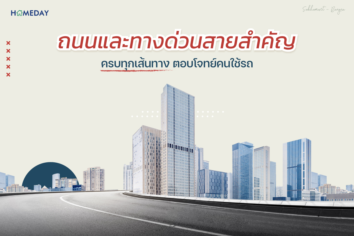 ถนนและทางด่วนสายสำคัญครบทุกเส้นทาง ตอบโจทย์คนใช้รถ การเดินทางในย่าน “สุขุมวิท-บางนา” ด้วยรถยนต์ส่วนตัว ถือได้ว่าเป็นทางเลือกที่มีความสะดวกสบายเป็นอย่างมากครับ เนื่องจากทำเลนี้ ตั้งอยู่กึ่งกลาง ระหว่าง CBD และ ชานเมือง ทำให้สามารถเดินทางเข้าถึงพื้นที่สำคัญ ๆ ต่าง ๆ ได้อย่างง่ายดาย โดยถนนเส้นหลักแน่นอนว่าคือ ‘ถนนสุขุมวิท’ นั่นเองครับ ซึ่งถนนเส้นนี้เริ่มต้นที่แยกแพรกพรรณ ในพื้นที่ของเขตพระโขนง และสิ้นสุดที่ทางแยกประชาอุทิศ ในพื้นที่ของเขตบางนา เชื่อมต่อกับถนนเส้นอื่น ๆ ที่มีความสำคัญมากมาย ทั้งถนนอโศก, ถนนเพชรบุรี, ถนนสาทร, ถนนสีลม, ถนนพระราม 4 ฯลฯ คนทำงานย่าน CBD บอกเลยว่าชิลครับ