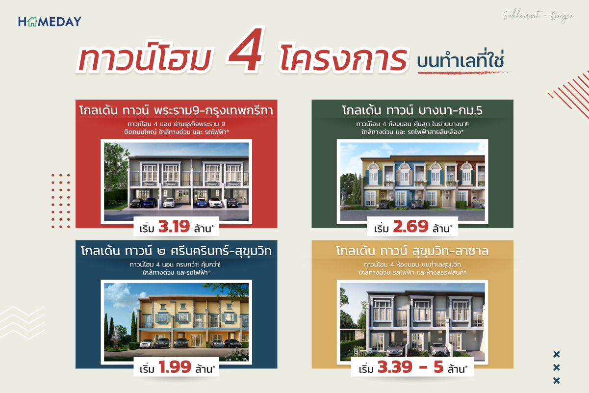 โครงการที่น่าสนใจในย่าน “สุขุมวิท-บางนา” ทำเลที่ครบครัน รองรับศักยภาพในทุก ๆ ด้าน เติมเต็มได้ทุกไลฟ์สไตล์ เดินทางแสนง่าย และยังเติบโตได้ต่อเนื่องแบบนี้ ไม่แปลกที่อสังหาริมทรัพย์จะขยายอย่างรวดเร็ว ทั้งคอนโดและบ้าน เพื่อรองรับความต้องการในการอยู่อาศัยในทำเลนี้กันมากขึ้น หากทำเลนี้โดนใจ เป็นหนึ่งในตัวเลือกที่อยากครอบครอง และกำลังมองหาเป็นโครงการทาวน์โฮมอยู่ ทาง เฟรเซอร์ส พร็อพเพอร์ตี้ โฮม ก็มีตัวเลือกโครงการที่น่าสนใจในย่าน “สุขุมวิท-บางนา” ให้เลือกถึง 4 โครงการ ได้แก่ โกลเด้น ทาวน์ ๒ ศรีนครินทร์-สุขุมวิท, โกลเด้น ทาวน์ บางนา กม.5, โกลเด้น ทาวน์ พระราม 9-กรุงเทพกรีฑา และโกลเด้น ทาวน์ สุขุมวิท-ลาซาล ครับ
