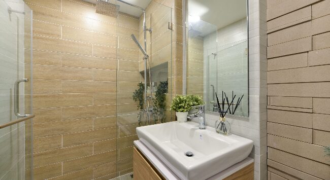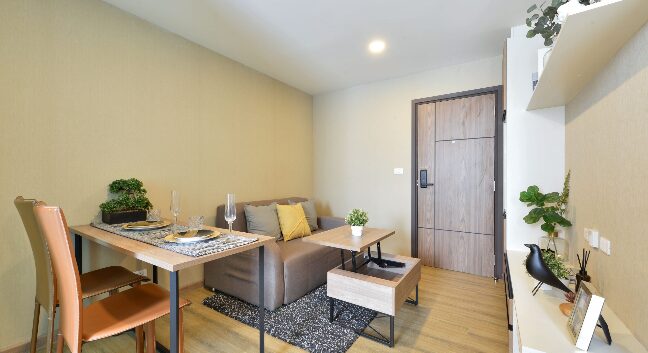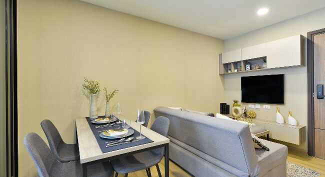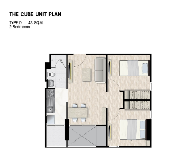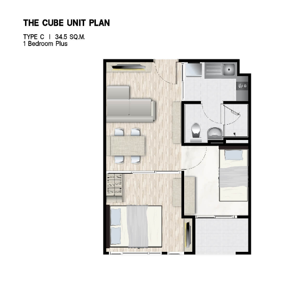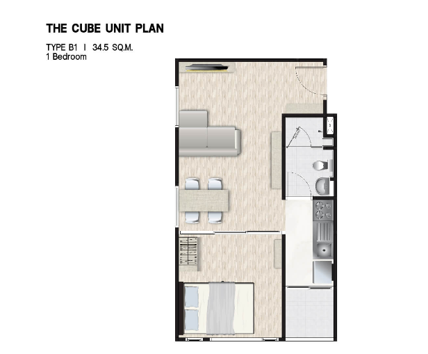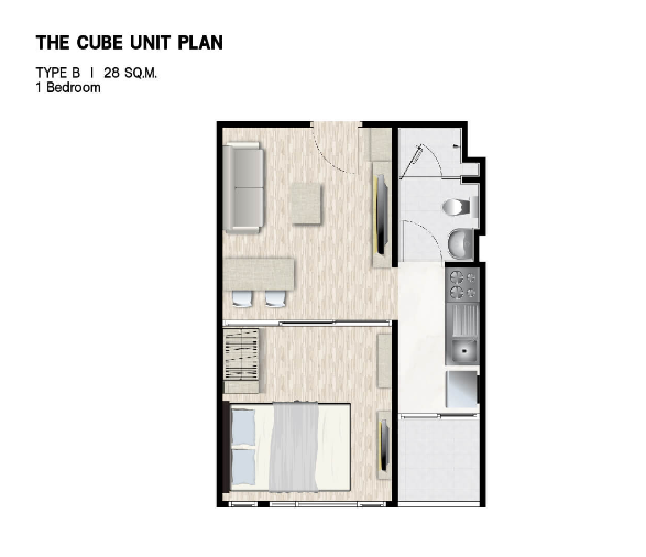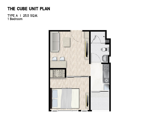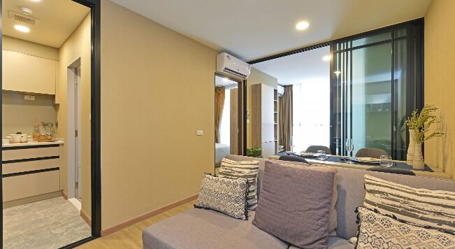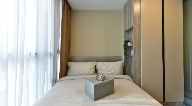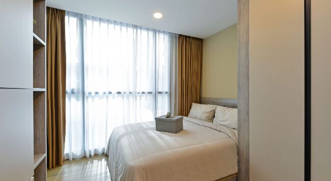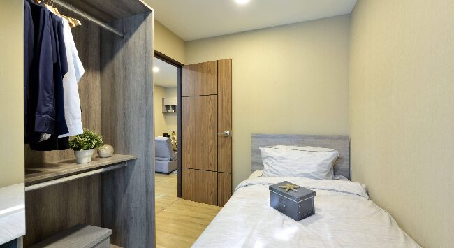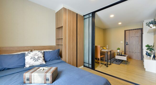 ห้องนอนจะมีประตูกระจกบานสไลด์ 3 ตอน กั้นพื้นที่ออกจากส่วนอื่น ๆ ของห้อง ให้ความเป็นสัดส่วน ซึ่งเราสามารถติดตั้งม่านเพิ่มเติมเพื่อเพิ่มความเป็นส่วนตัวไ