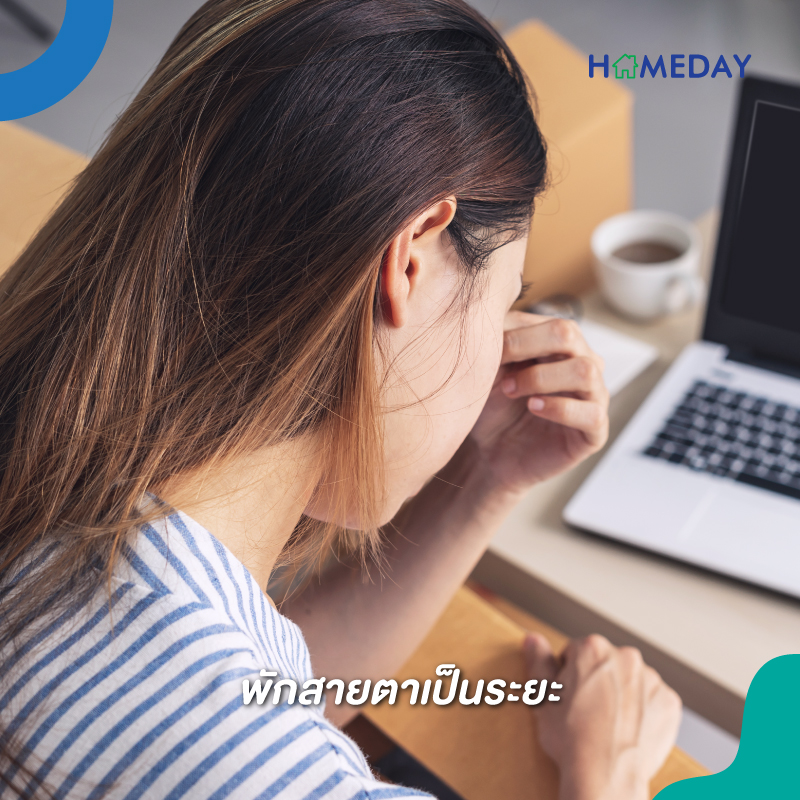 สำหรับการ WFH ที่ต้องทำงานใช้สายตาทั้งวันอยู่กับคอมพิวเตอร์ จะต้องมีการพักสายตาบ้างนะคะ แนะนำให้พักทุก 1-2 ชั่วโมง ครั้งละ 5-10 นาที ด้วยการมองไปที่ไกลๆพร้อมทั้งกระพริบตาบ่อยๆจะช่วยให้รู้สึกดีขึ้น เพราะการใช้สายตาต่อเนื่องเป็นเวลานานทำให้เกิดอาการตาล้า และเสี่ยงต่อการเป็นภาวะของโรคตาแห้งได้ และยังทำให้เกิดโรคจอประสาทตาเสื่อมได้อีกด้วยนะคะ ดังนั้นเราควรพักสายตาเป็นระยะเพื่อถนอมดวงตาของเราจ้า