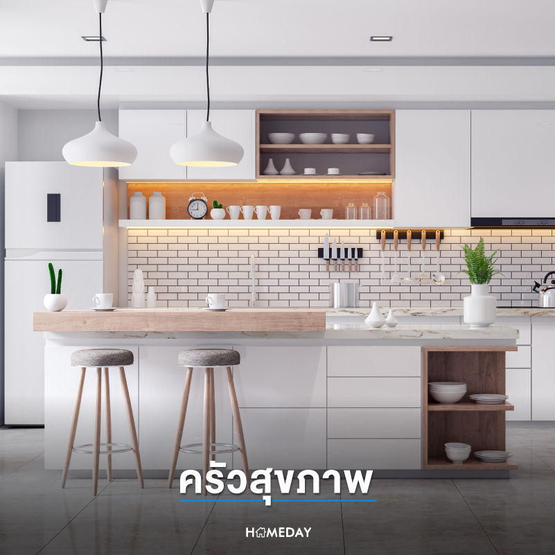 ห้องครัวเป็นอีกพื้นที่สำคัญในการดูแลสุขภาพของครอบครัว เพราะการทำอาหารที่ดีมีผลต่อการมีสุขภาพที่ดี เริ่มต้นจากการจัดพื้นที่เตรียมอาหารให้กว้างขวางและสะดวกสำหรับการทำอาหารเพื่อสุขภาพ เพิ่มสวนผักไฮโดรโปนิกส์ในบ้านเพื่อปลูกผักสดสำหรับทำอาหารในแต่ละวัน