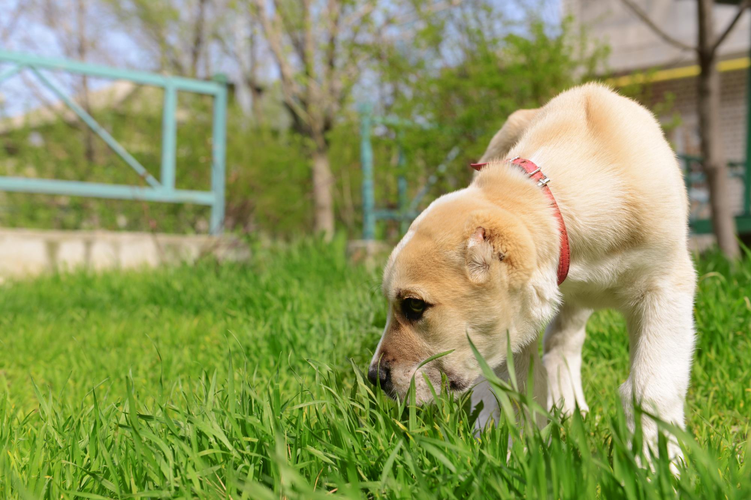 หญ้าในพื้นที่สาธารณะหรือสวนอาจมีการฉีดยาฆ่าแมลงหรือปุ๋ยเคมี ซึ่งเป็นอันตรายต่อสุนัขหากกินเข้าไป สารเคมีเหล่านี้อาจทำให้เกิดอาการแพ้ พิษ หรือปัญหาสุขภาพอื่นๆ